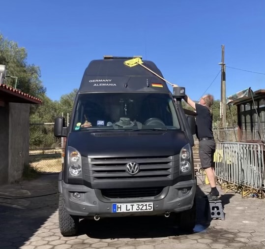 Leider ist die Batterie hinüber und der Anlasser sagt nichts mehr. Mina, die Betreiberin des Campingplatzes, holt zuerst ihr eigenes Auto für die Starthilfe und, als das nicht ausreicht, einen Mechaniker. Mit zwei Batterien gelingt das Starten und Rocky blubbert so vor sich hin.