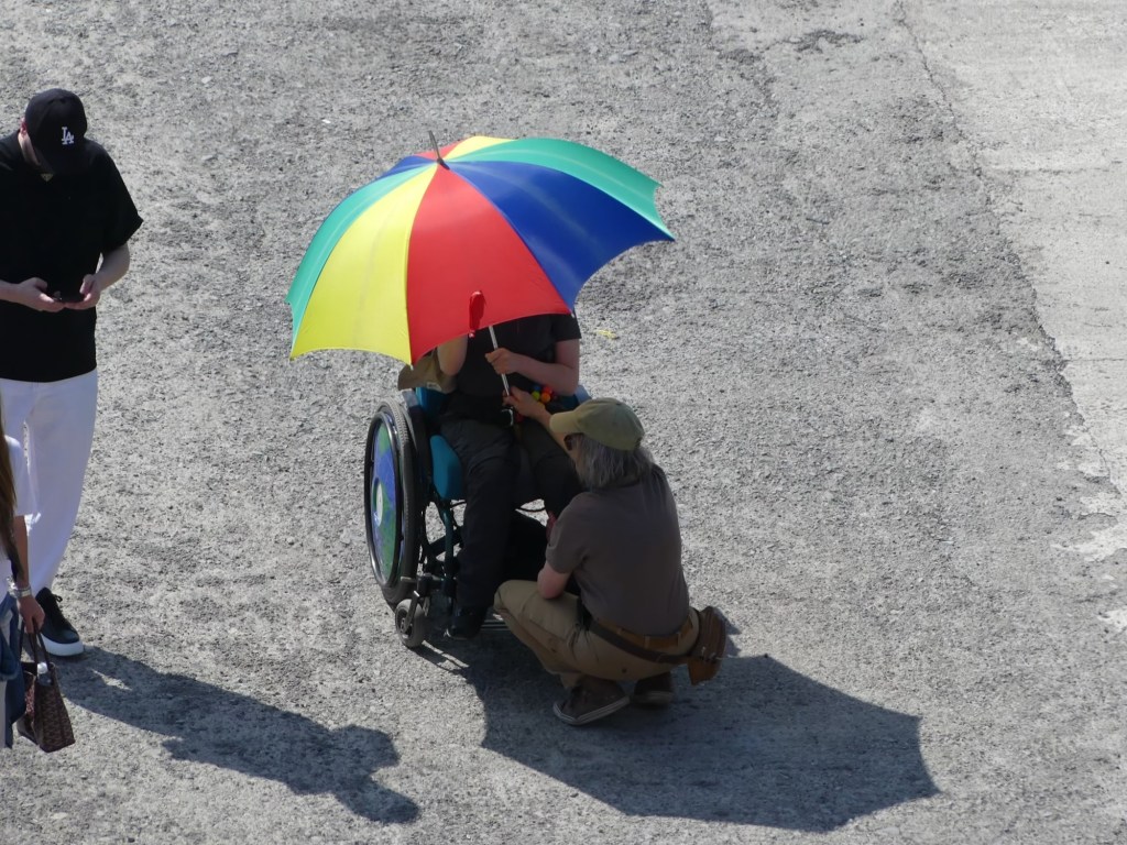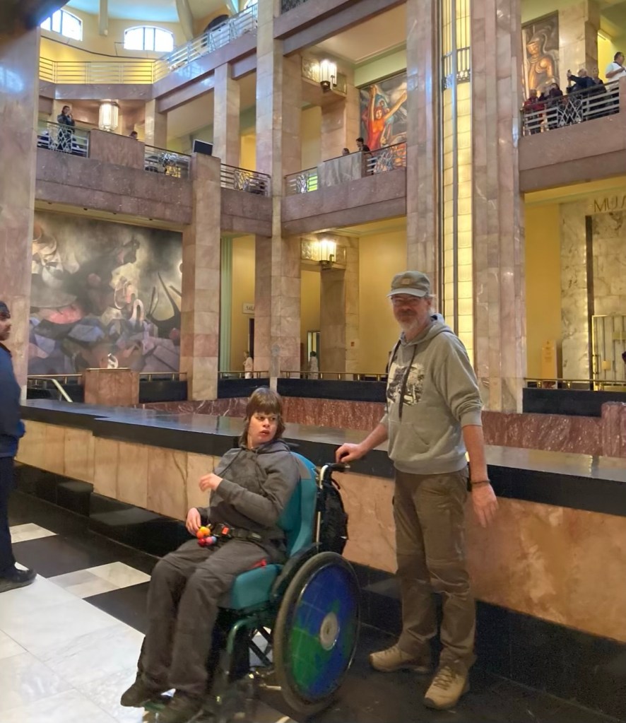 Nach einiger Mühe und Suchen nach dem Eingang für Rollifahrer und dem „komm wir gehen da jetzt einfach rein“ gelangen wir über das Untergeschoss und einen Aufzug mit Aufzugfahrerin ins Foyer. Die Karten für das Museum bekommen wir geschenkt und so bringt uns besagte Aufzugfahrerin auch in die Ausstellungsetagen.