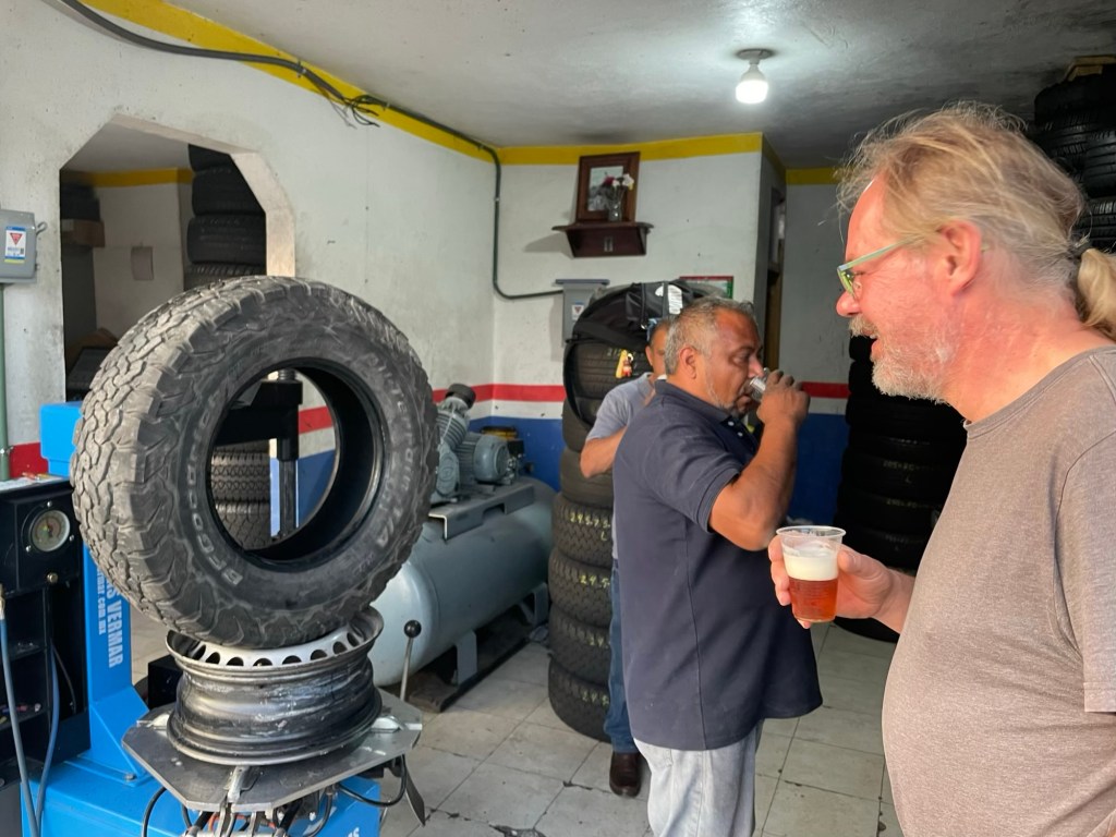 Für heute (Freitag) hat Sergio schon einen Termin in der Werkstatt gemacht, eine Ersatzbatterie haben wir gestern noch leihweise eingebaut bekommen. Heute wird nun das Kühlerror getauscht, die Staubmanschetten erneuert, die neue Batterie eingebaut und gleich noch Öl und Ölfilter gewechselt. Dabei hat Yaix (der Mechaniker) gesehen, dass im rechten Vorderreifen ein Nagel steckt. Wird gleich mit gemacht und Clemens muss im Reifenladen auch gleich noch ein mexikanisches Bier probieren. 🍺