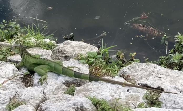 Mitten in der Stadt treffen wir auf Leguane. (Der Futterkasten ist für die Grauhörnchen.)