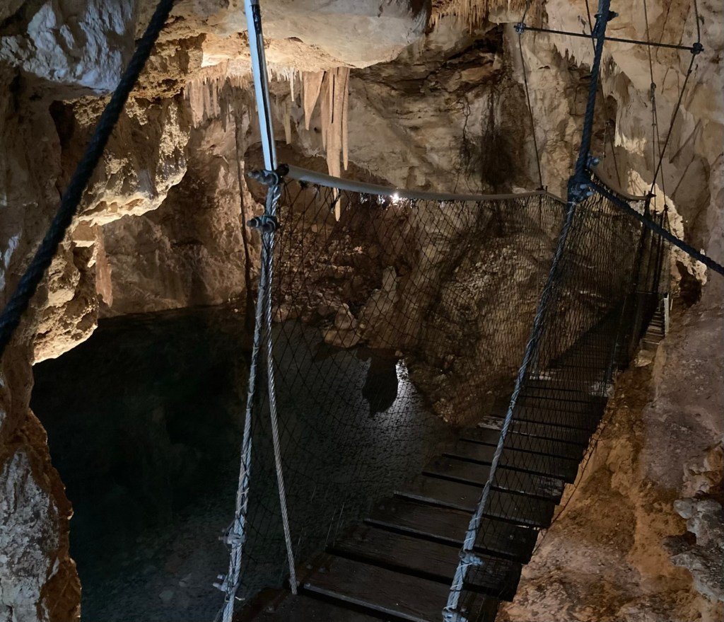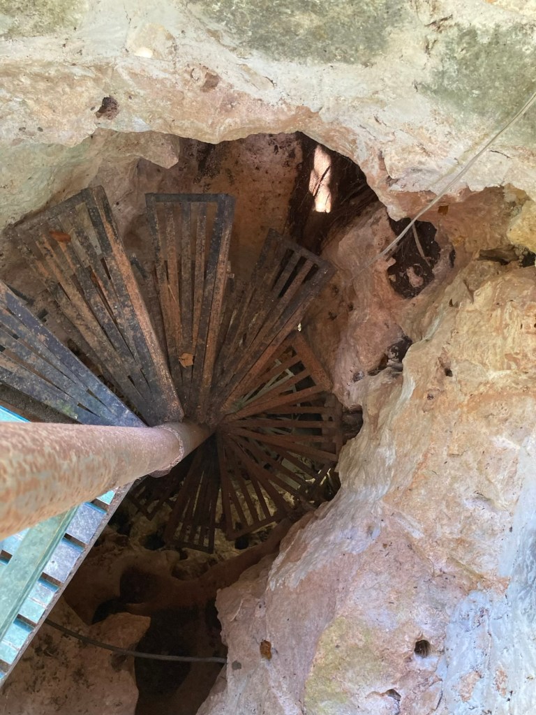 Die Cenote selbst ist etwas kribbelig zu erreichen. Wendeltreppe, Tunnel und Hängebrücke inklusive. Dann aber das glasklare Wasser.