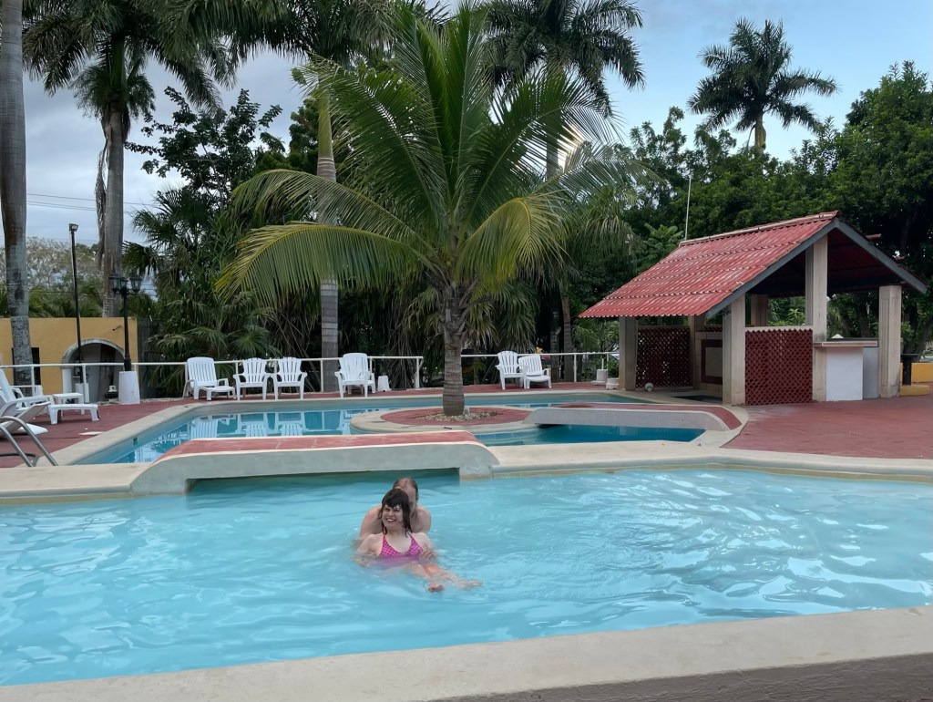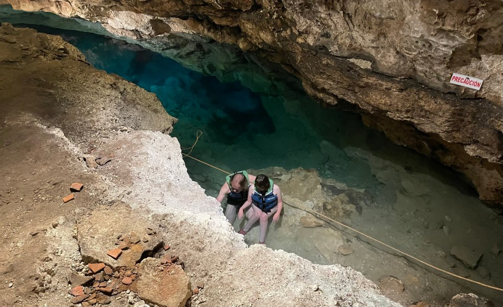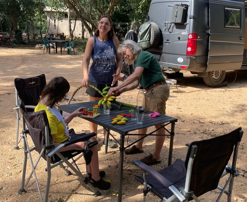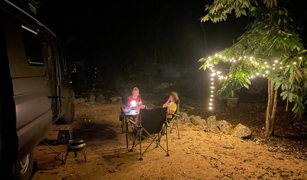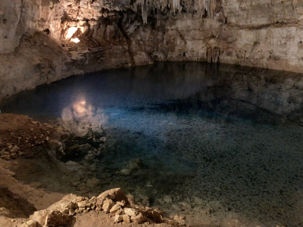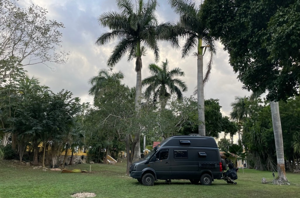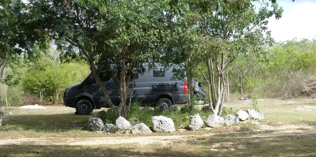 So, nun aber erstmal genug der alten Steine. Unser nächstes Ziel ist viel älter und natürlichen Ursprungs. Die Yucatán Halbinsel besteht aus Kalkstein, der im Laufe der Jahrtausende ausgewaschen wurde. Die entstandenen Höhlen sind teilweise eingestürzt und geben so Zugänge zu unterirdischen Seen frei. Die Cenoten waren den Maya heilig und sind heute spannende Bedemöglichkeiten. Wir steuern die Cenote „Mani-Chan“ an. Die Zufahrt ist mal wieder spannend und wir nehmen einige kleine Zweige mit. Wird Zeit, dass Rocky Astabweiser bekommt, bevor wir uns die PV-Module vom Dach reißen.