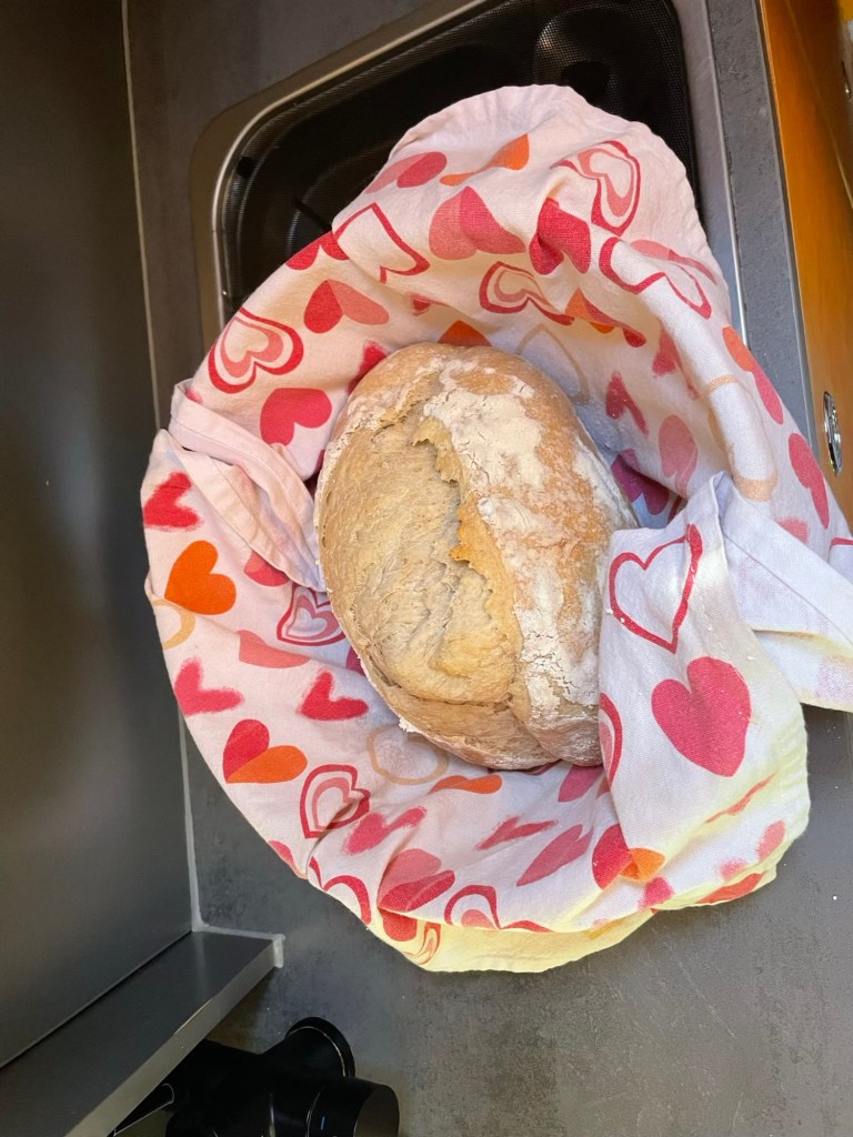 Die Dusche genießen wir unter blauem Himmel im schön angelegten Garten (Andrea sagt „Dschungeldusche“) und zum Abschied nehmen wir noch ein selbstgebackenes Sauerteigbrot mit.