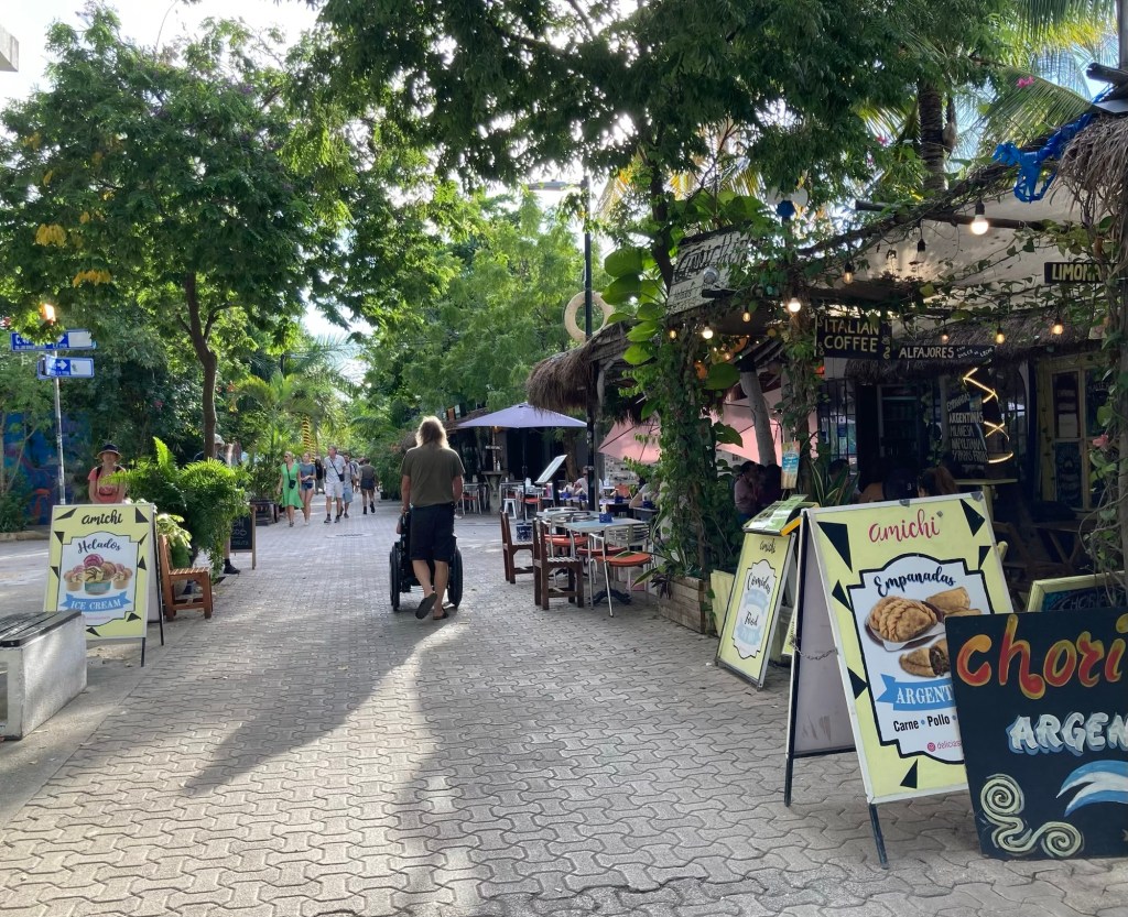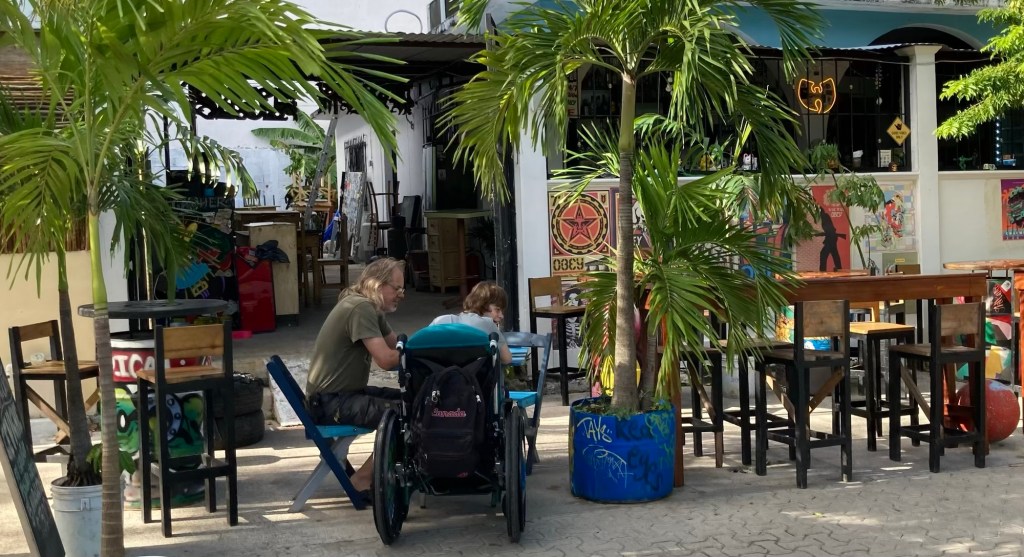 So können wir nach zwei Stunden weiter fahren. Unser nächstes Ziel ist Playa del Carmen. Wie sich herausstellt ist der Ort fest in Touri-Hand. Eine Nippesbude reiht sich an das nächste Restaurant. Wir suchen uns erstmal einen Stellplatz etwas abseits und treffen zufällig auf eine Reiseleiterin aus München, die schon einige Jahre hier lebt. Wir klönen eine ganze Weile und sie empfiehlt uns eine kleine Bar, die auch lecker Tacos anbietet. Die stellen gleich einen Tisch raus, an dem auch Lina gut essen kann.