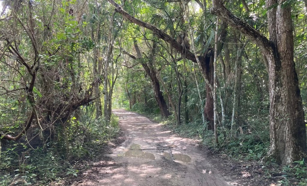 Nach kurzer Nacht zieht es Clemens in die Einsamkeit. „Ein Stück weiter gibt es einen Platz am Wasser, den wir letztens in einem Video gesehen haben“, „findest du den in iOverlander?“ fragt er, und so rumpeln wir, nach nur 10 km asphaltierter Straße, einen schmalen Weg durch dichten Dschungel zur Lagune runter.