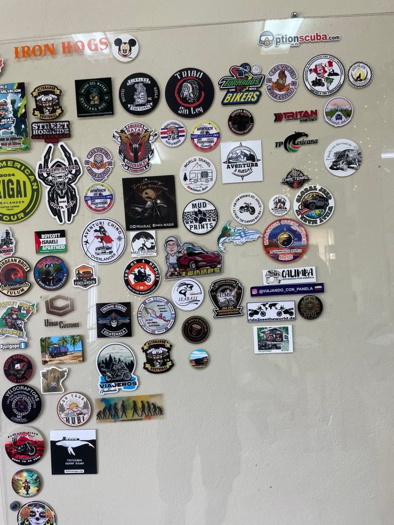 Inzwischen stellt sich heraus, dass VW in Mexiko das Ersatzteil tatsächlich nicht liefern kann, und wir überlegen ein Provisorium einzubauen, um weiterfahren zu können. Eduardo und seine Werkstatt finden wir über iOverlander und sie bauen eine ähnliche Staubmanschette ein. Das sollte erstmal für ein paar Wochen halten. Zum Abschied müssen wir uns noch auf der Wand in der Werkstatt „verewigen“. 😉