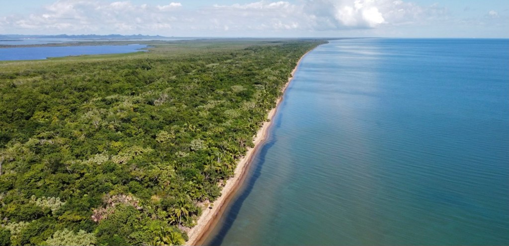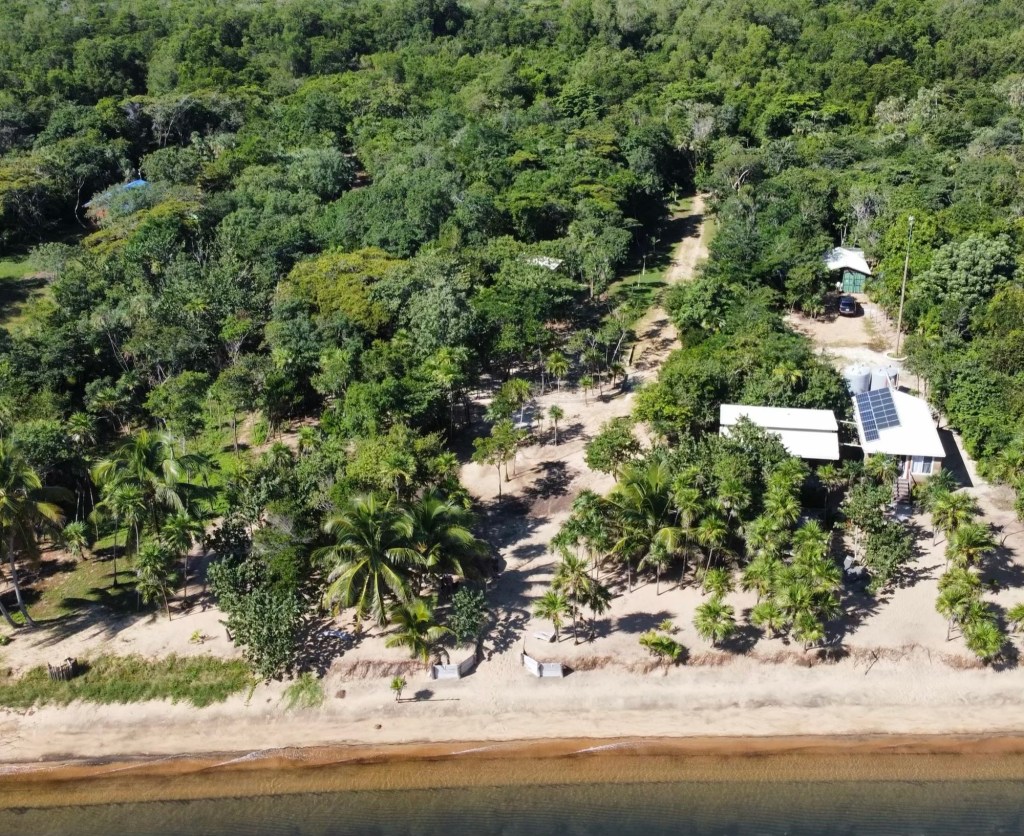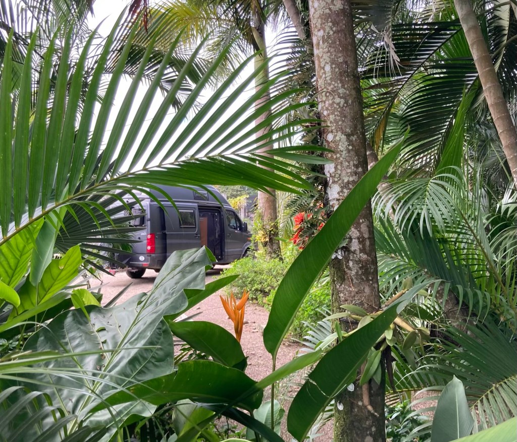 Nach kurzer Nacht zieht es Clemens in die Einsamkeit. „Ein Stück weiter gibt es einen Platz am Wasser, den wir letztens in einem Video gesehen haben“, „findest du den in iOverlander?“ fragt er, und so rumpeln wir, nach nur 10 km asphaltierter Straße, einen schmalen Weg durch dichten Dschungel zur Lagune runter.