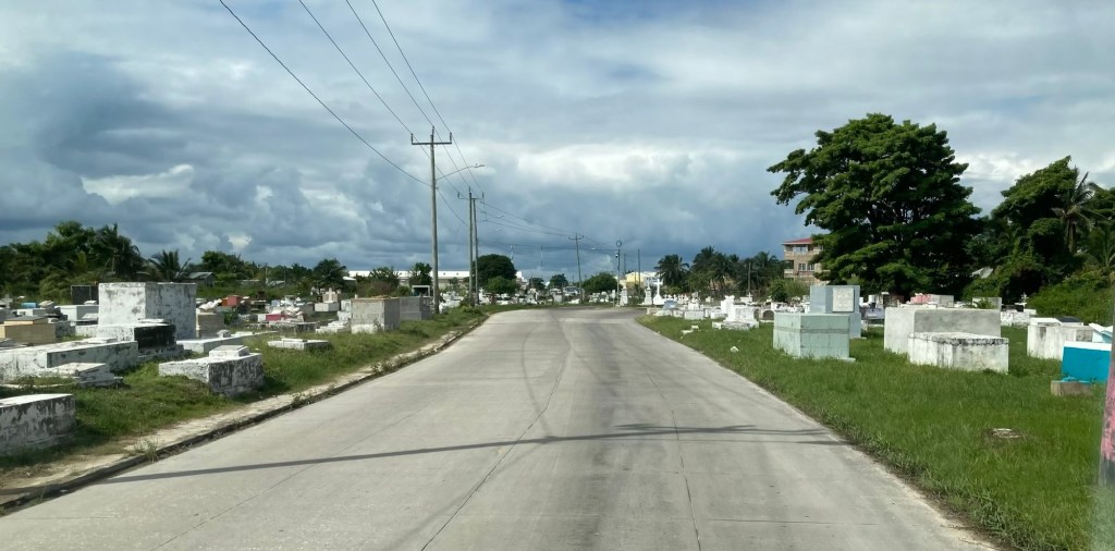 Heute treibt es uns wieder raus aus der Stadt, wir wollen den karibischen Strand genießen und steuern einen Stellplatz ein Stück weiter südlich an. Erstmal führt die Straße mitten durch den Friedhof von Belize City.