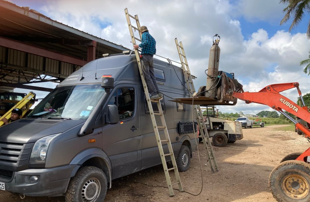 Inzwischen hat sich auch John von ACROSS wieder gemeldet und verspricht uns die Lieferung unseres neuen Kompressors innerhalb einer Woche. So bleibt uns noch Zeit, Belize weiter zu erkunden. Zuerst mal möchte Clemens noch Astabweiser auf das Dach haben. Bei ‚Jacob Janzen’ werden wir fündig, fahren hin und die machen gleich ein „Aufmaß“.