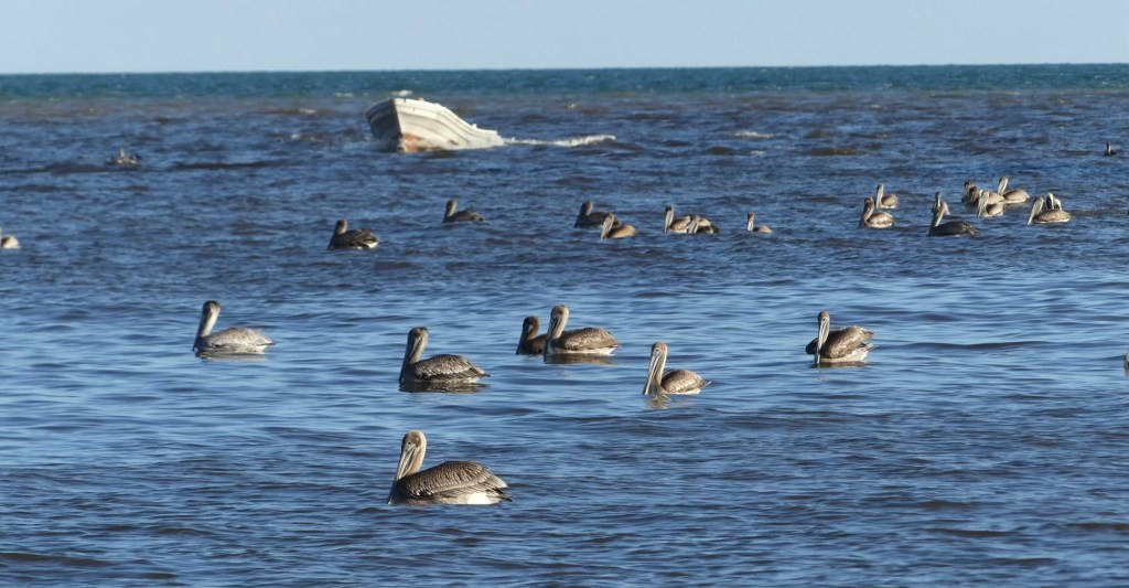 In der Hafenzufahrt können wir unzählige Pelikane beobachten, die anscheinend einen Fischschwarm gefunden haben und sich richtig den Bauch voll schlagen.