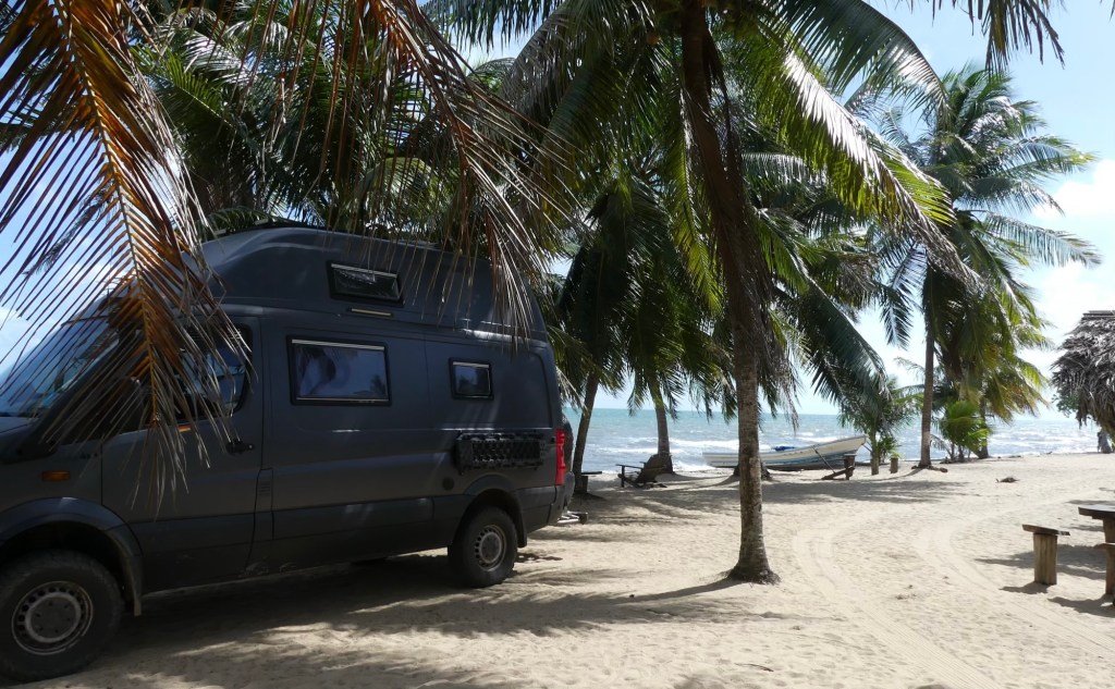 Wir sind in Belize, dem 5. Land auf unserer Panamericana. Der Grenzübertritt war alles in allem entspannt. Zuerst den Ausreisestempel bei der Immigration abholen, dann zum Aduana (Zoll) und die temporäre Einfuhr von Rocky wieder zurück geben. Die Beamtin hat sogar Fotos von Rocky gemacht! Und weiter zur belizischen Seite. Erst zur Fumigation (Rocky wird von außen besprüht). Ein freundlicher „Helfer“ kommt gleich danach ans Auto und möchte uns beim Bezahlen „unterstützen“. „Hola Amigos, 300 Peso por favor“ sagt er. Wir wissen, dass das Besprühen 12 Belize$ oder 6 US$ kostet, er möchte umgerechnet 15 US$ haben. Clemens diskutiert kurz mit ihm und geht dann selbst zum Bezahlen in das kleine Häuschen. Der gute Mann ist beleidigt und meint nur „Germany is a rich country“. Clemens erwidert, „Es gibt dort aber auch ehrliche Leute, die nicht betrügen wollen“, bezahlt die 6 US$ und verschwindet. Die weitere Einreise mit Immigration und Customs verläuft ohne Probleme. Nach gut einer Stunde haben wir 30 Tage Aufenthaltsrecht in Belize. Nun stehen wir an der Versicherung und brauchen noch eine Haftpflichtversicherung für Rocky. Der Schalter sieht nach vielen Overlandern aus. 😉