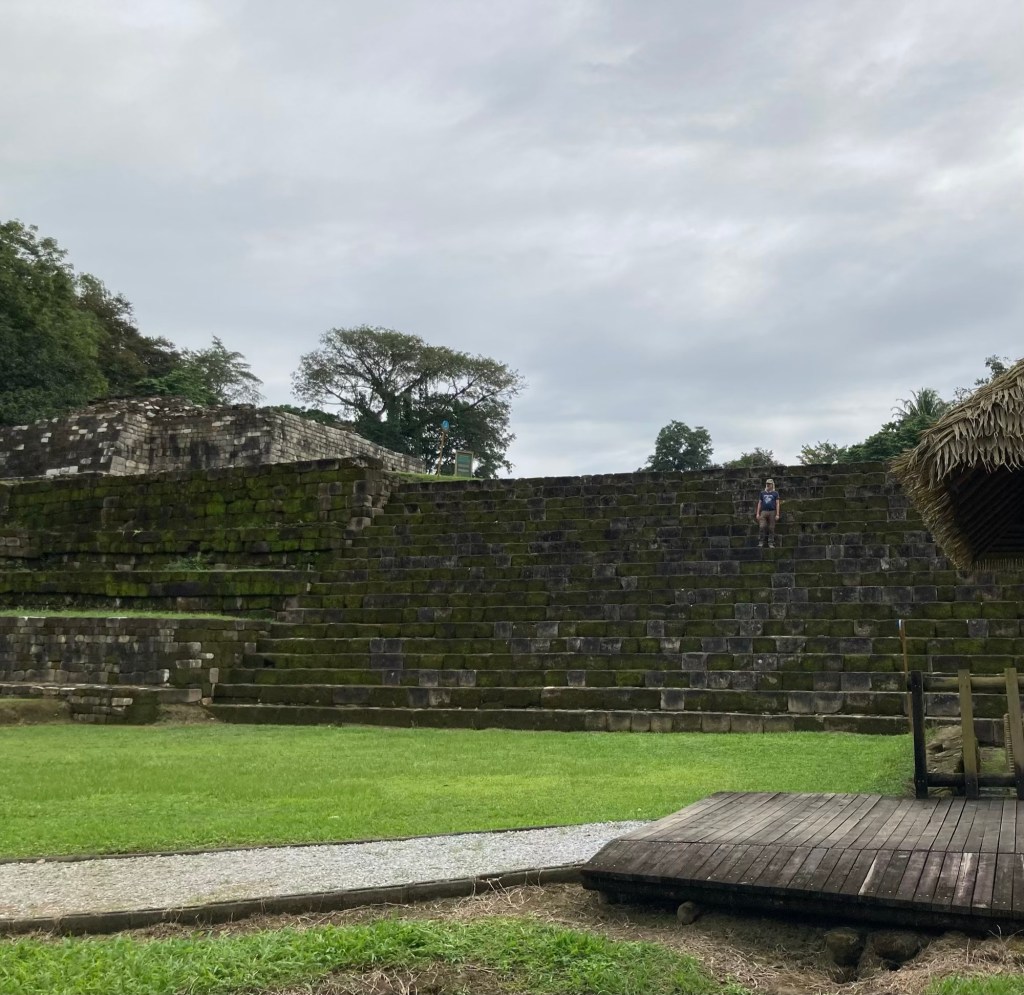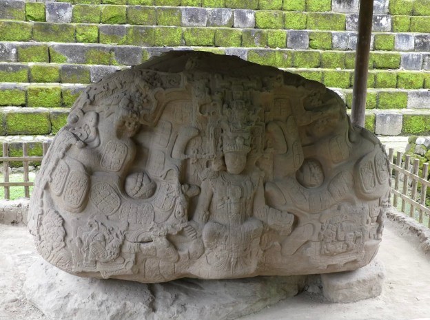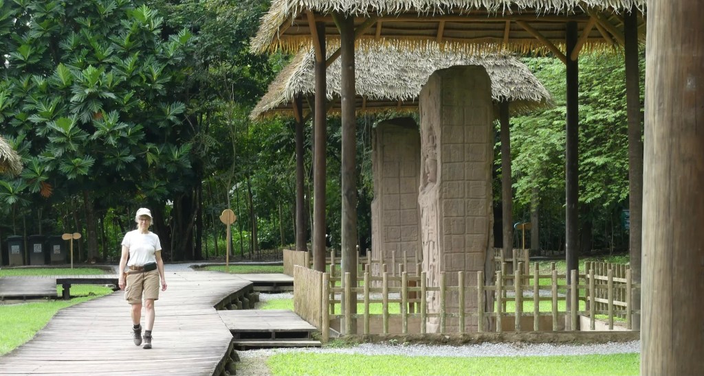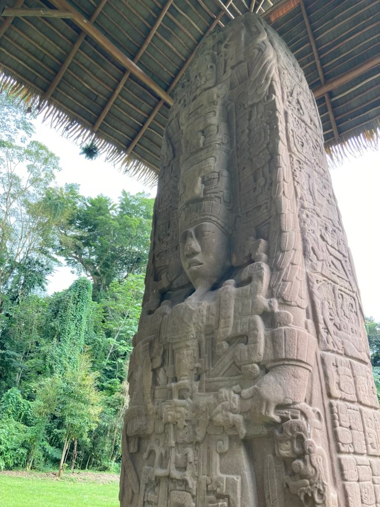 Die ganze Anlage liegt heute in einem riesigen Bananen-Anbaugebiet. Erschreckend ist, dass die Stelen überdacht werden müssen. Nicht um sie vor dem Regen zu schützen (das haben sie über tausend Jahre ausgehalten) sondern vor den Hinterlassenschaften der Sprühflugzeuge, die ununterbrochen über die Bananenplantagen fliegen. Ich mag gar nicht darüber nachdenken, was für Zeug sie da auf die Bananen sprühen, das selbst Steine kaputt macht. Aber lassen wir uns die (billigen) Bananen schmecken…