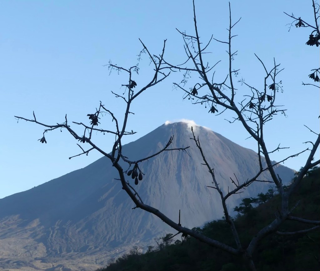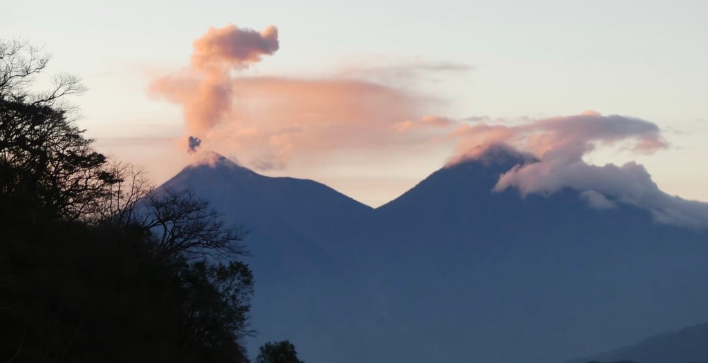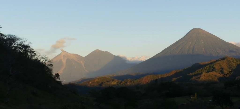 Die drei oben sind der Fuego (knapp 3800 m und zur Zeit sehr aktiv), der Acatenango (knapp 4000 m) und rechts der Agua (3766 m) Etwas näher bei uns liegt der Pacaya (ca. 2500 m)