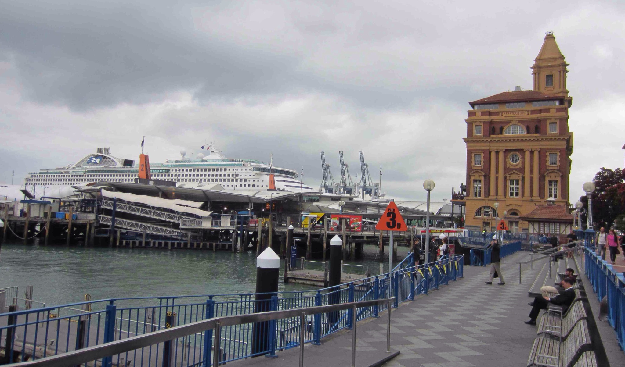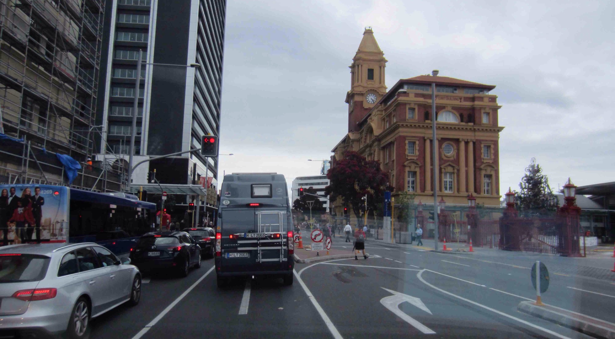 Heute wollen wir zum Stadtrundgang in der City von Auckland starten. Kurz bevor wir losfahren ruft der Spediteur an, er braucht noch den Schlüssel für den hinteren Bereich des WoMos. Also erst zum Hafen fahren, den Mitarbeiter anrufen und Schlüssel für die Zollabfertigung und die Quarantänebesichtigung abgeben. Nun erst mal was essen und dann zur Stadtbesichtigung. Unser Parkplatz am Viaduct Basin ist noch frei, doch gerade angekommen ruft der Spediteur wieder an, um uns mitzuteilen, dass wir unser Auto sofort abholen können. Also wieder zurück zum Hafen, telefonieren und warten. Dann kommt die Übergabe, und es ist alles OK. Keine Dellen, Schrammen oder andere Schäden erkennbar.
