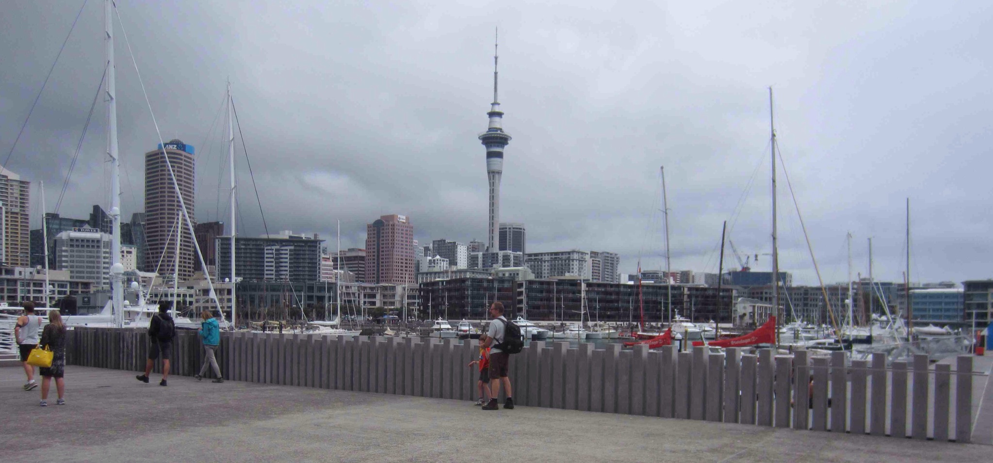 Gleich nebenan im Viaduct Basin liegen riesige Yachten und die alten Cuper der Kiwis vom Americas Cup (die haben die „Bodenlose Kanne“ auch mal gehabt und sich durch die Schweizer wieder abnehmen lassen). Von der Fußgängerbrücke hat man einen klasse Blick auf die Skyline des CBD von Auckland.