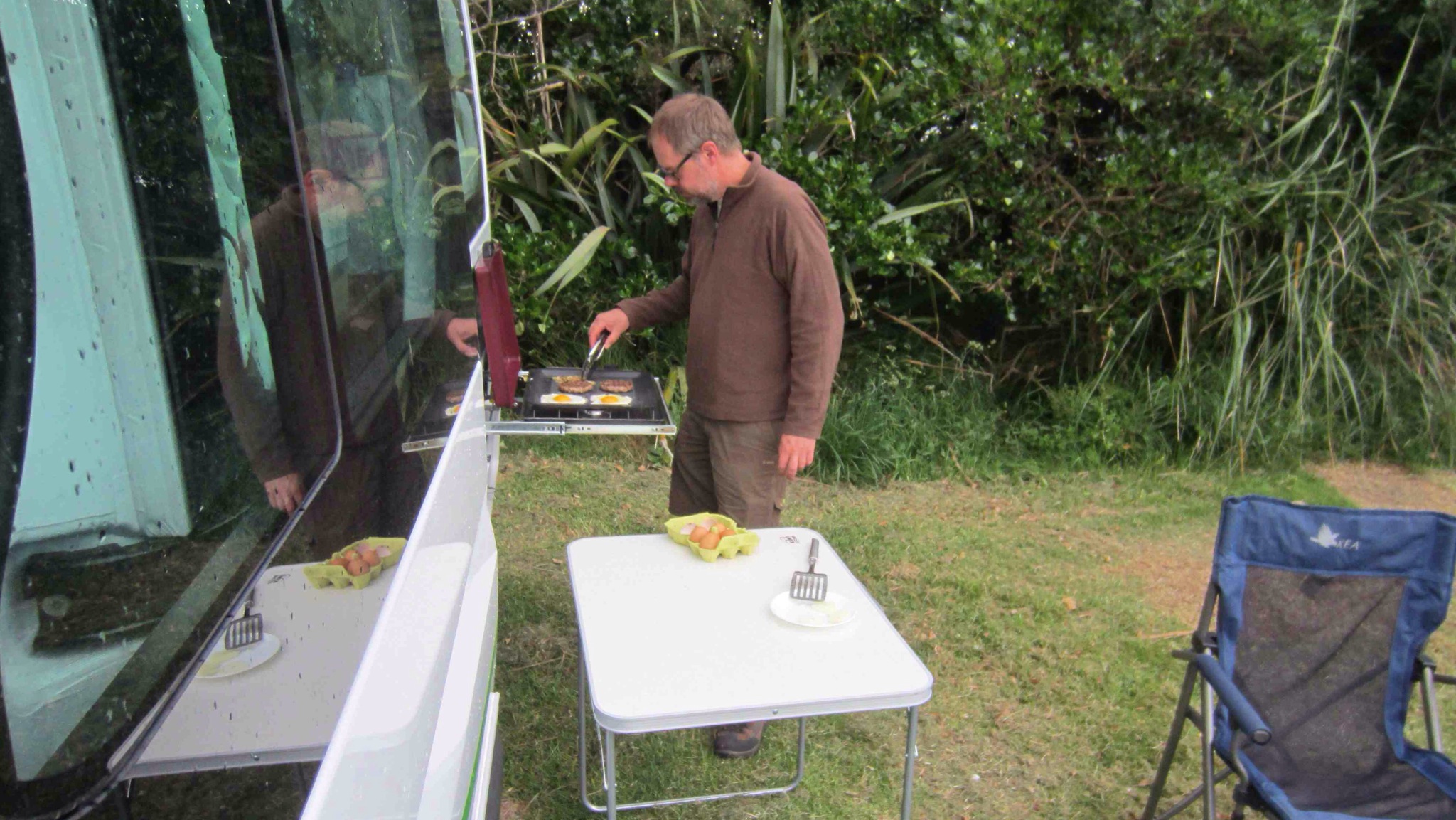 Praktisch ist der ausziehbare Gasgrill im Mietmobil schon, meint der GvD (Griller vom Dienst)