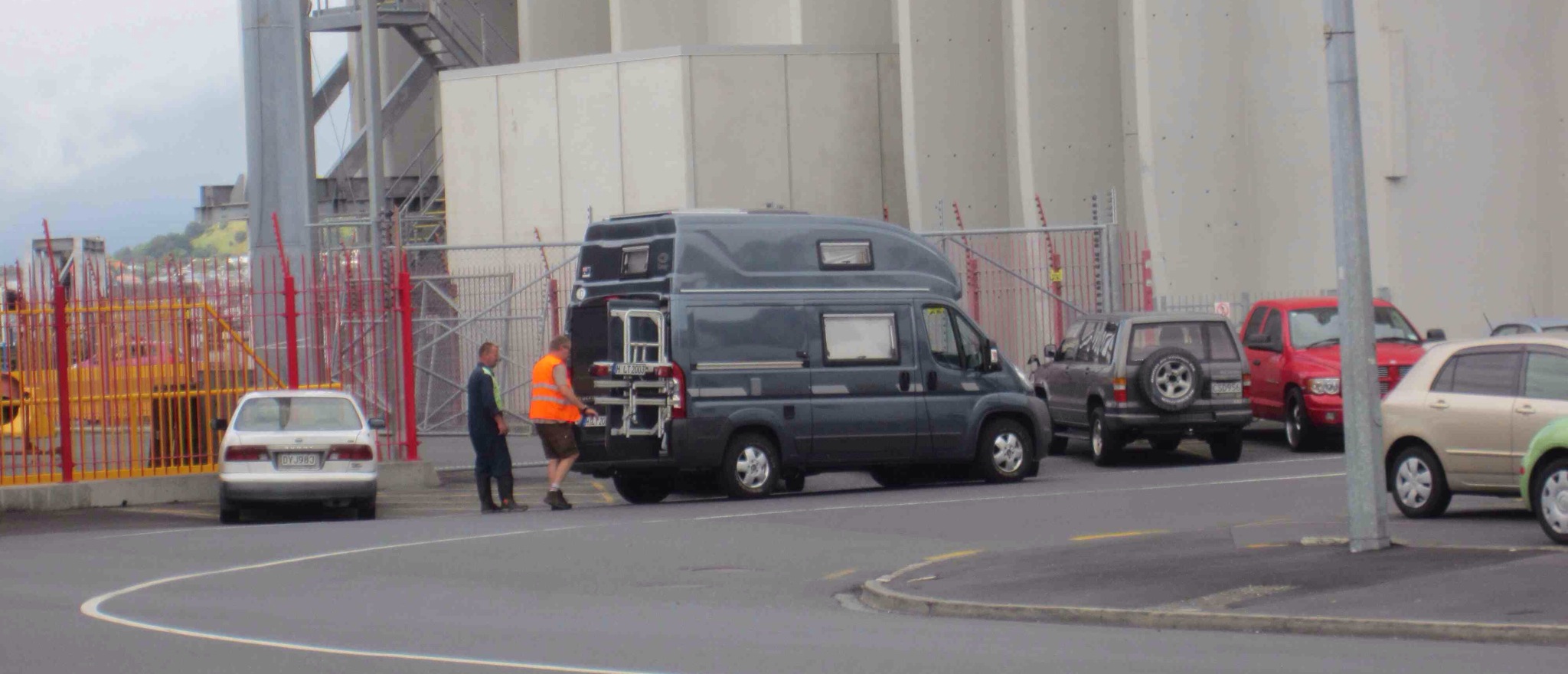 Zuerst fahren wir heute zum Spediteur und holen das Carnet de Passage wieder ab. Der Zoll hat die Ausfuhr unseres Autos bereits bestätigt, obwohl wir noch drin sitzen und fröhlich durch Auckland kutschen. Na ja war in AUS ja auch nicht anders. Dann zum Flughafen, einchecken und die Reisetaschen aufgeben. So haben wir jetzt nur noch leichtes Gepäck und Linas Buggy. Den können wir nachher bis zum Flugzeug mitnehmen. So nun wartet auch schon ein Mitarbeiter vom Porthandling am Hafen auf uns. Wir schrauben noch schnell die Trennwand zwischen Fahrerhaus und Wohnraum wieder rein, lassen das restliche Frischwasser noch ab und dann wird unser Heim der letzten gut fünf Monate ins Hafengelände gefahren. Am 21.2. fährt dann das Schiff Richtung Deutschland. Tschüss Henri. 😦