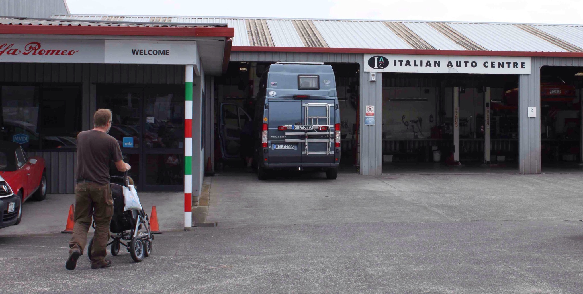 Erstmal geben wir unser gemietetes Mobil wieder ab und holen, zufällig in der Nachbarschaft, das abgestempelte Carnet von Spediteur ab. Dann zur Kfz-Registrierung. Die nächstgelegene Stelle ist der VTNZ (so’ne art TÜV mit Aufgaben der Straßenverkehrsbehörde). Da ist die Sachbearbeiterin leicht überfordert und stellt erstmal eine neue Registrierung mit neuen Kennzeichen aus. Clemens besteht allerdings auf die Deutschen Kennzeichen, sie muss den gesamten Vorgang stornieren und neu beginnen. Danach noch die technische Untersuchung, so gründlich wie bei uns der TÜV mit check von Radaufhängung, Bremstest auf einem Prüfstand, Lichttest (auch mit den abgeklebten Scheinwerfern für Rechtsverkehr bestanden) und sogar die Sicherheitsgurte werden überprüft. Dann klebt, nach der Zulassung, der zweite Aufkleber innen an der Frontscheibe. Eine Straßenbenutzungsgebühr brauchen wir nicht zahlen, die fällt erst über 3,5 t an – Glück gehabt. Nun zum Versicherungsbroker. Die „Camper Care“ verlangt keine inländische Adresse und nun haben wir auch eine Versicherung (in NZ nicht Pflicht). Da wir seit einiger Zeit Schwierigkeiten mit der Kupplungsbetätigung haben, fahren wir noch zu einer Fiat Werkstatt. Unser Boxer ist in AUS und auch in NZ unbekannt. Der baugleiche Fiat läuft hier aber als WoMo-Basisfahrzeug und auch als Kasten. Der Chef meint nach längerer Prüfung, das Problem liegt beim Masterzylinder (am Pedal) und nicht am aufwändig zu tauschenden Slavezylinder im Getriebegehäuse. Die Reparatur können sie sofort ausführen, wenn unser „Großer“ in die Wekstatt passt. Gemeinsam ausprobiert, und es passt. Der Chef mein das dauert nur „a couple of houres“ und wir gehen zwischenzeitlich in die nahe Mainstreet shoppen. Nach zwei Stunden sind wir wieder da