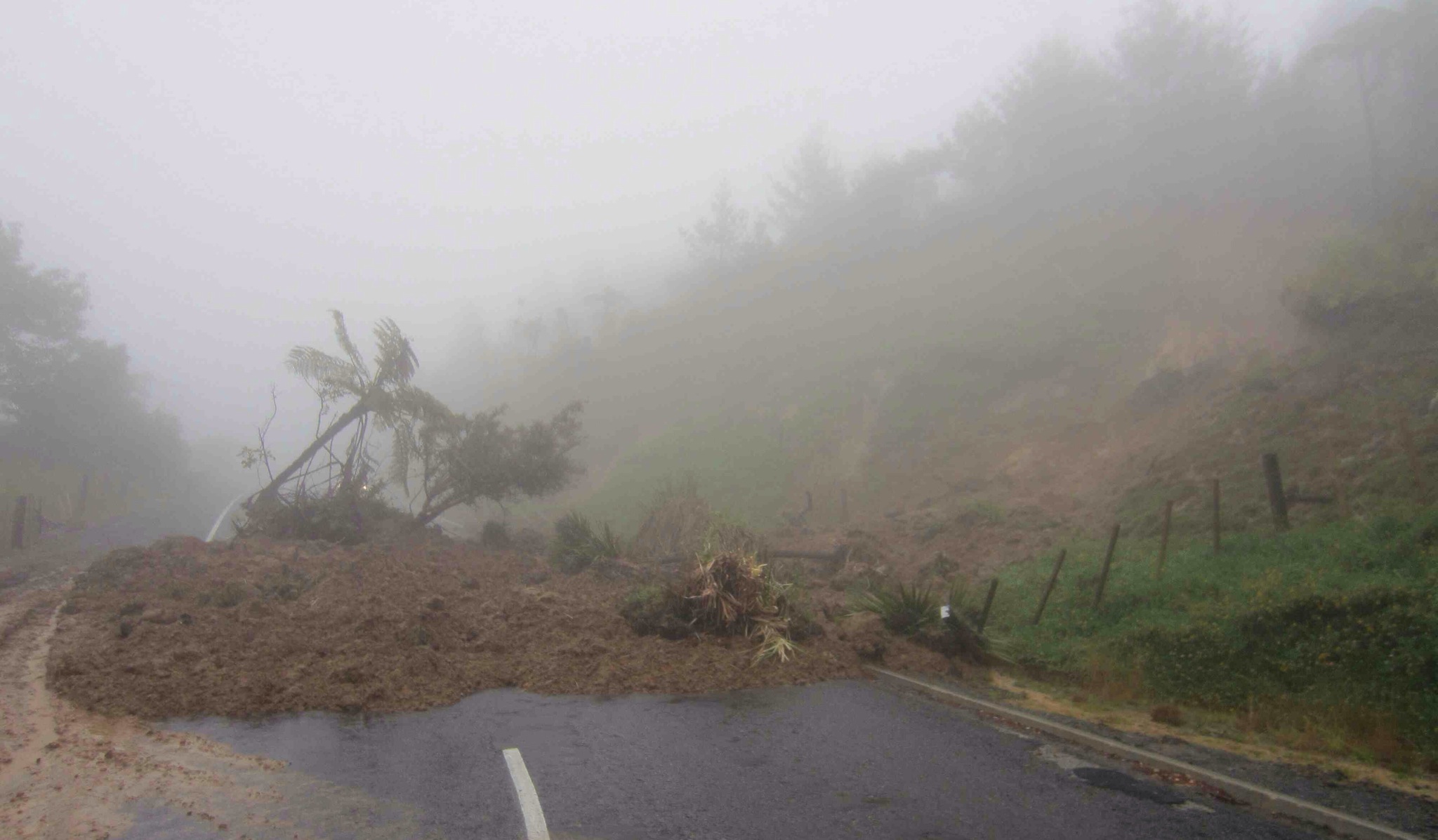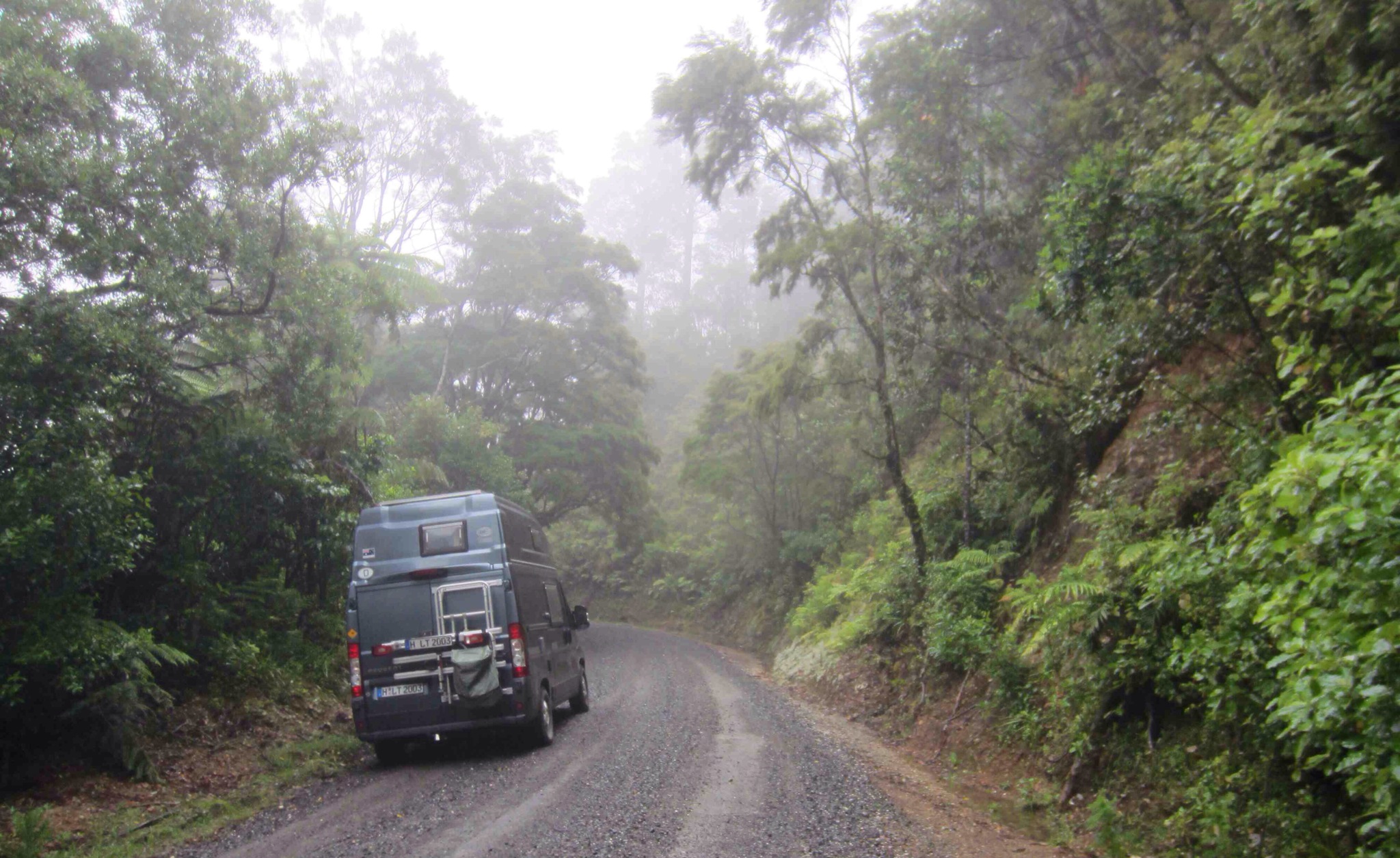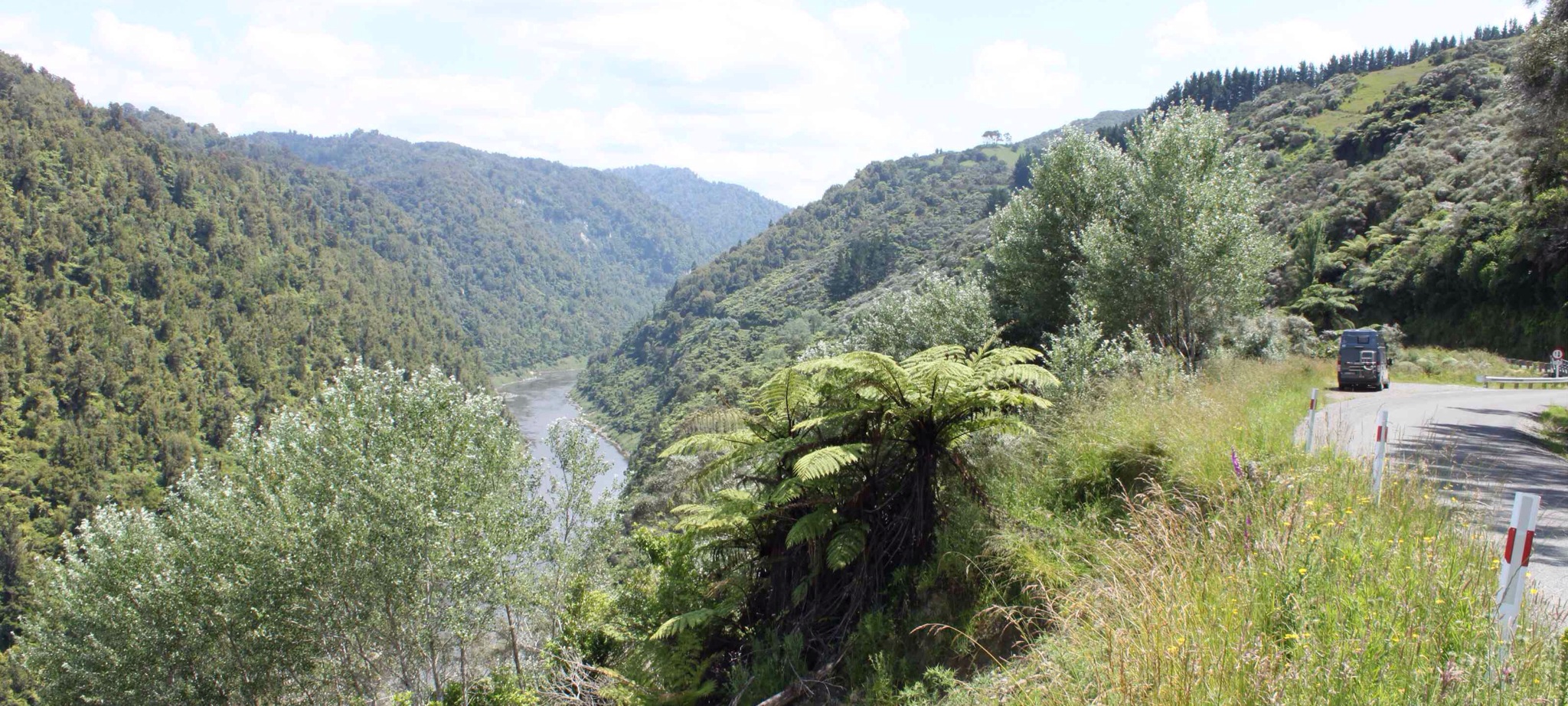 zum heutigen Übernachtungsplatz am Tangarakau Scenic Reserve. Die 4 km Straße hierher ist wirklich sehr schmal und teilweise abgerutscht, hoffentlich regnet es über Nacht nicht so stark, dass noch mehr den Hang runterrutscht. Dann wird’s morgen echt eng…