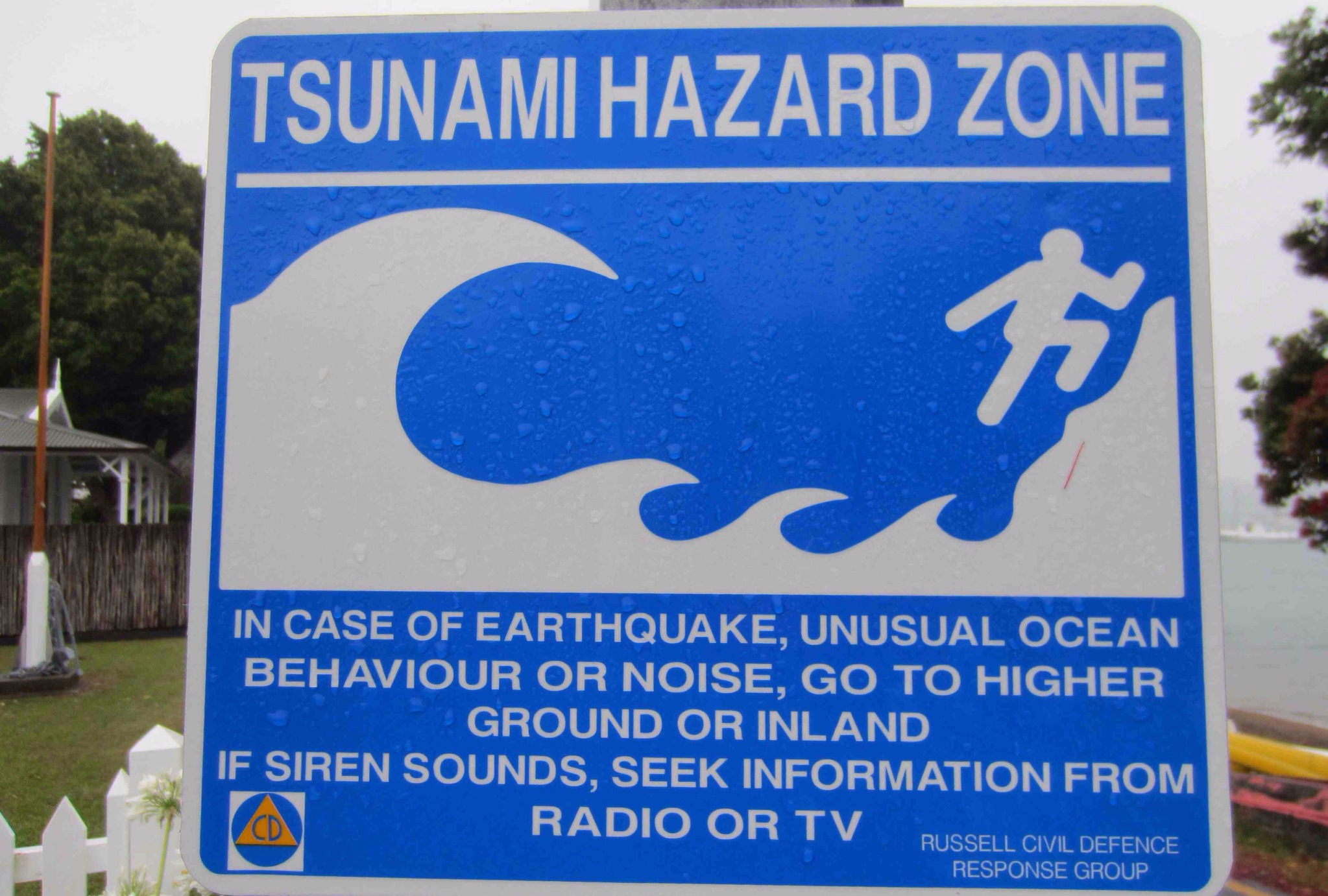 Russell selbst mag bei Sonne betrachtet ganz schön sein, bei Regen und Wind ist ein Spaziergang auch an der schönsten Uferpromenade eher trist. Dann kommen wir noch an einem Schild vorbei, das plötzlich viele schreckliche Bilder im Kopf produziert und uns verdeutlicht wo wir, geologisch betrachtet, eigentlich sind.