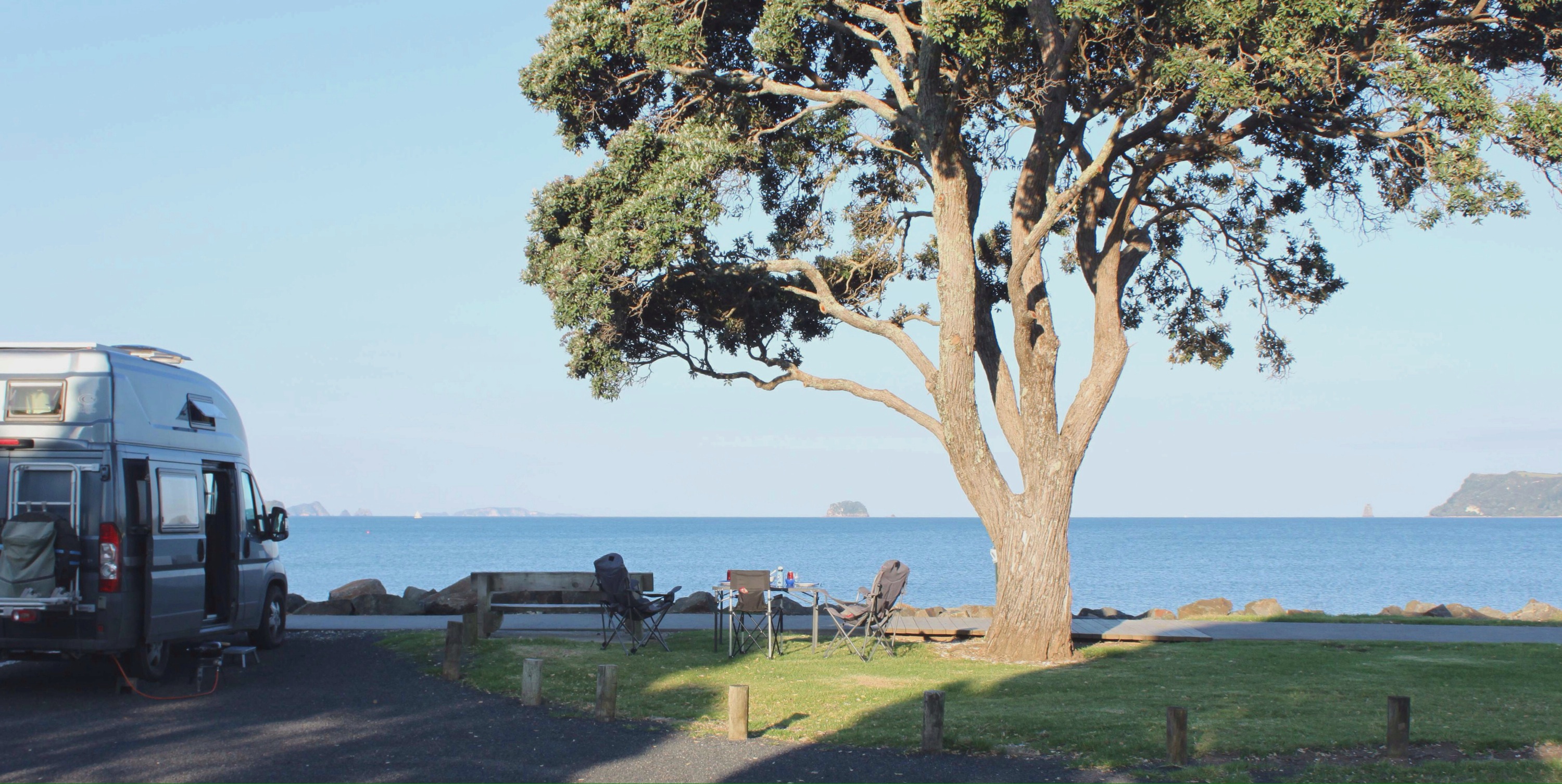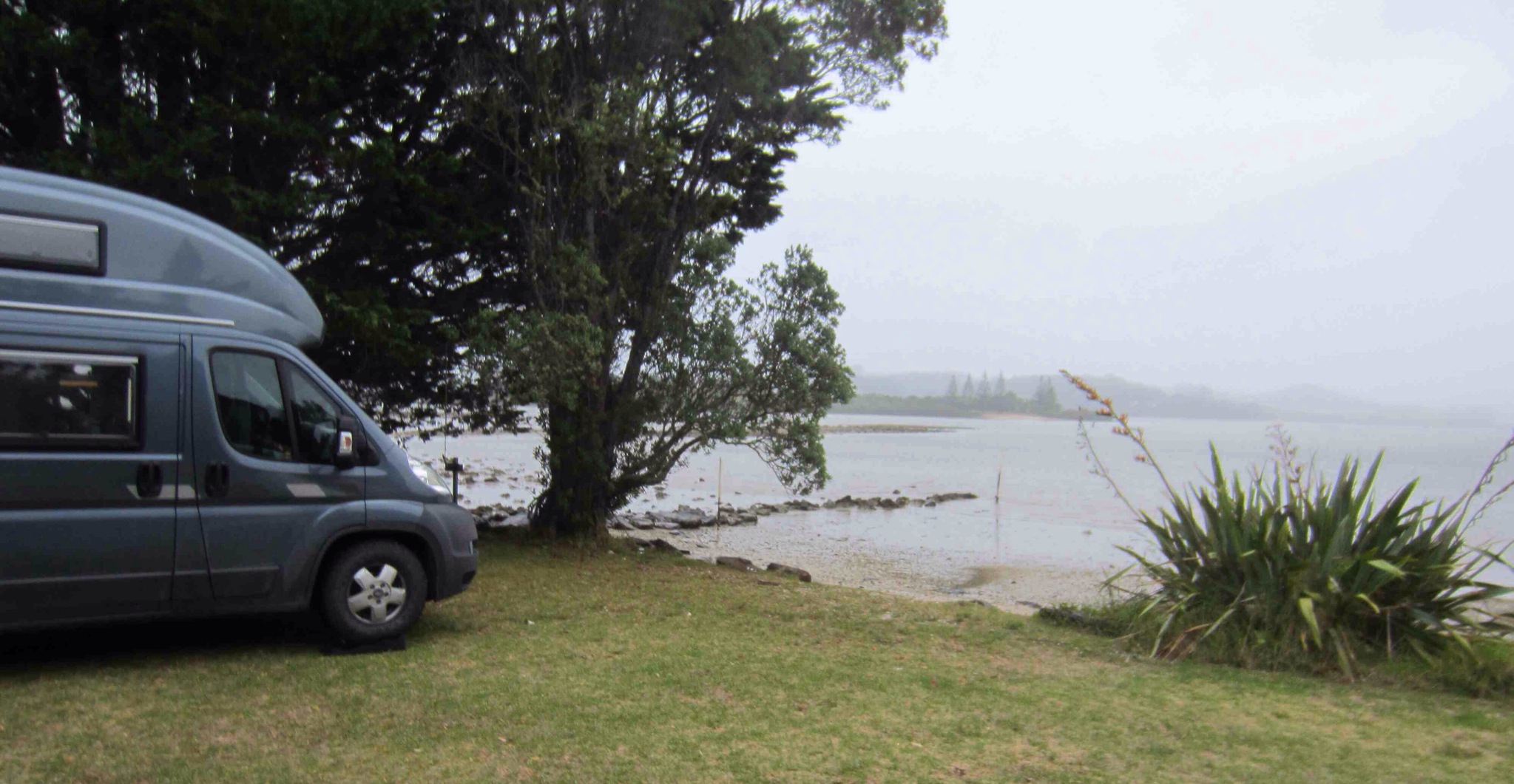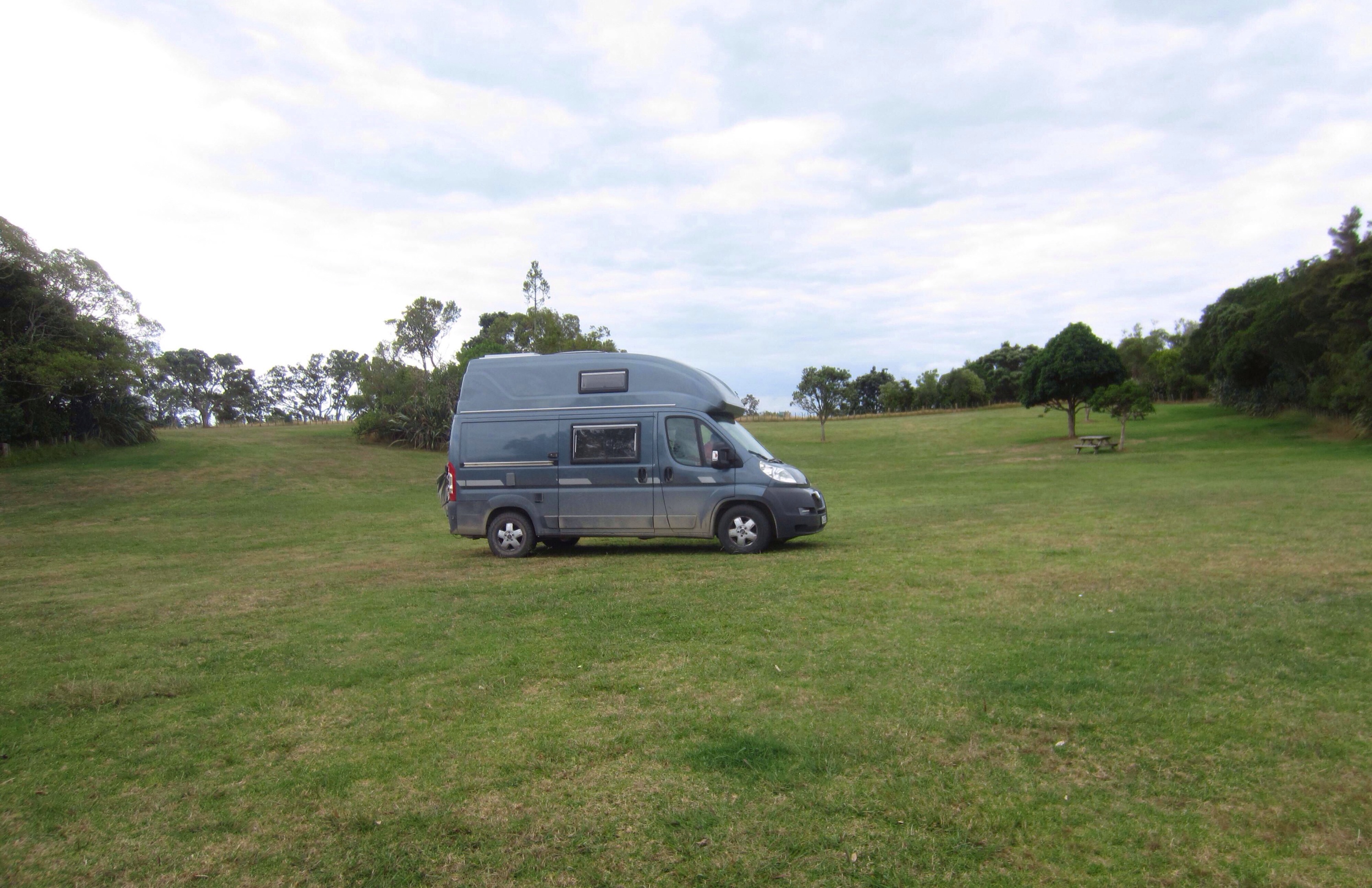 Noch ein wenig Küstenstraße genießen. Von Thames aus umrunden wir den Firth of Thames südlich und genießen hier und da die tolle Aussicht. Da uns das Bargeld ausgeht und wir heute Nacht in einem Regional Park, der bar bezahlt werden muss, übernachten wollen, fragt Clemens in einem kleinen Laden mit Tankstelle nach, wo der nächste ATM (Geldautomat) ist. Wie zu erwarten war, gibt es hier in der Nähe keinen. Der nächste ATM ist in Auckland. Aber so hilfsbereit wir die Kiwis nunmal sind, wird ihm sofort eine Barauszahlung aus der Ladenkasse angeboten. Mit 50 $ Barem kommen wir dann am Campground an. Hier hat man vor zwei Wochen, wie der Campground Host später berichtet, auf Kartenzahlung am Telefon umgestellt. Nach langer und umständlicher Prozedur mit persönlichem Gesprächspartner, Zahlungsautomat und zum Schluss wieder einer richtigen Person am Telefon bekommen wir den Code für das Zahlenschloss am Tor und können uns dann auf der weitläufigen Wiese einen Platz aussuchen. Die 50$ haben wir nun immer noch in der Tasche… 🙂