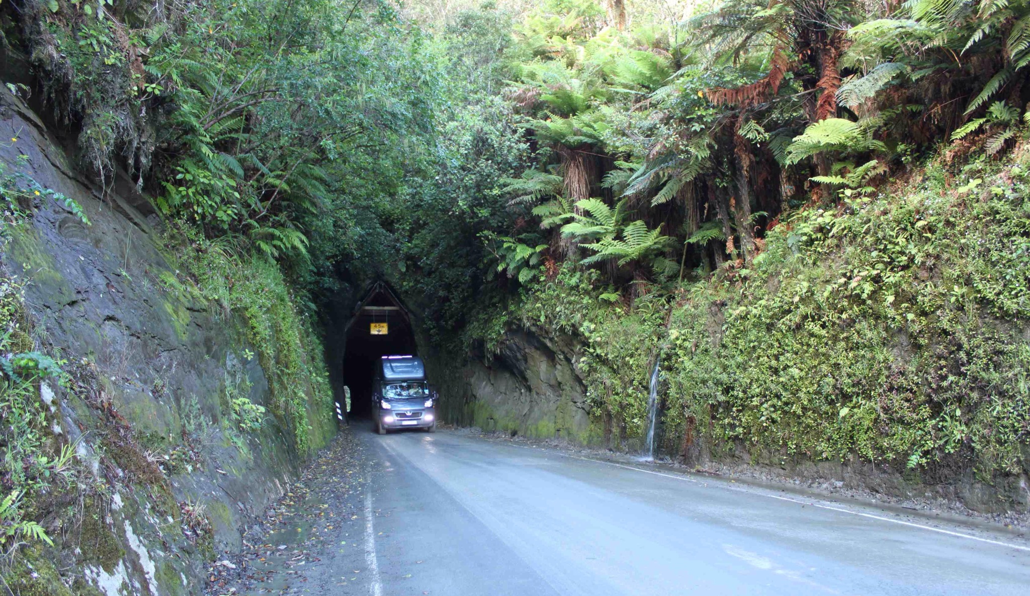 Wir starten nach dem Frühstück (wegen der Fliegen drinnen) weiter den Buller River entlang zur Westküste. Zwischendurch ist der Highway einspurig in den Fels gehauen,