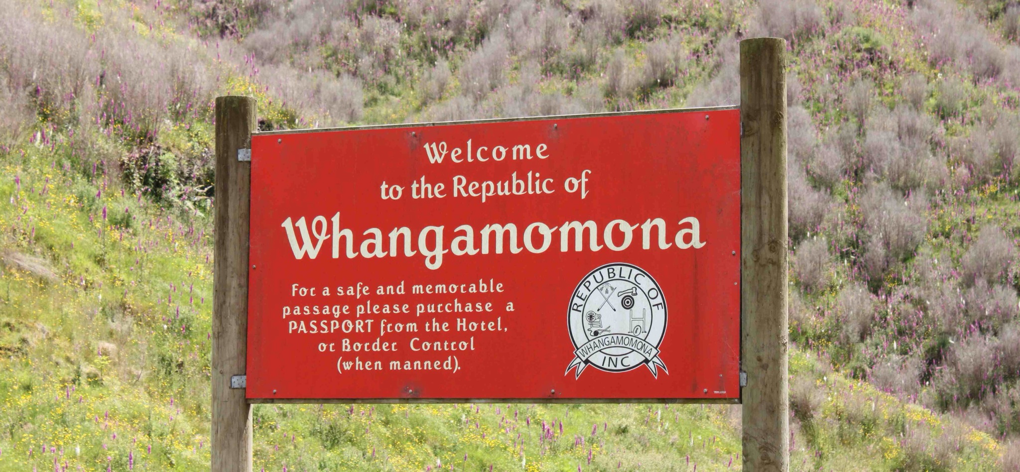 Weiter durch grüne Hügellandschaft dann wieder Regenwald und steile Berghänge, über schmale Asphalt- oder Schotterstraßen erreichen wir überraschend die Republic of Whangamomona. Diese wurde 1989 von den Bewohnern der Region, aus Protest gegen eine Verwaltungsreform, ausgerufen.