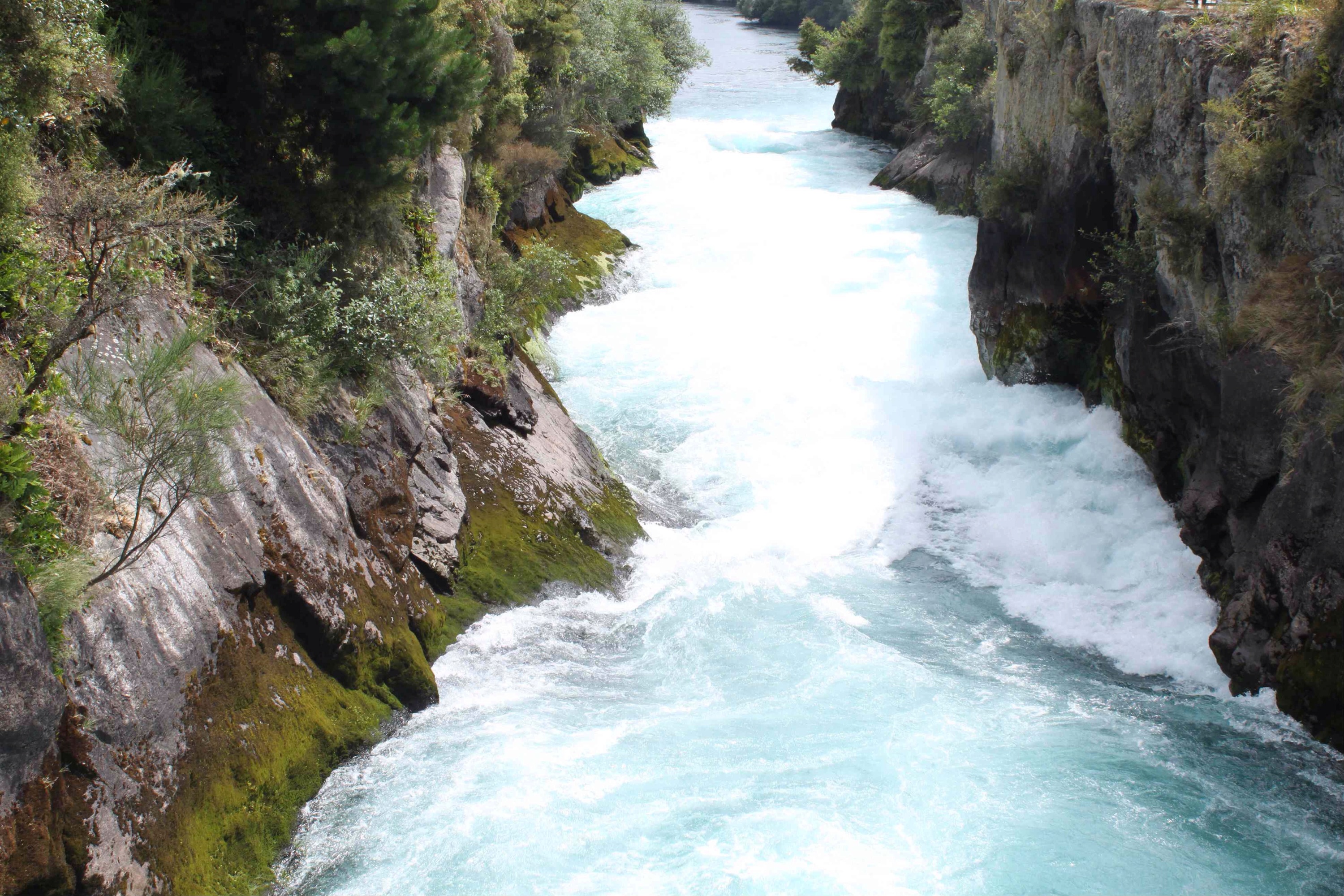 Der untere Teil des Campgrounds gleicht eher einem „alternativen Jugendlager“ mit ausgelassener Stimmung und die ganze Nacht Party. Wir sind glücklicherweise auf dem oberen, eher von Familien mit Kindern genutzten, Teil gelandet. Nach dem Frühstück (unten gucken die ersten Partygäste auch aus den Zelten) sehen wir uns die Huka Falls an. Im Reiseführer steht „Neuseelands meistbesuchte Naturattraktion“ und das bedeutet, wie wir erleben dürfen, viele viele Menschen. Der Waikato River tost hier spektakulär mit bis zu 250.000 l/s Wasser durch eine 15 m breite Schlucht. Trotz der vielen Besucher ein klasse Schauspiel.