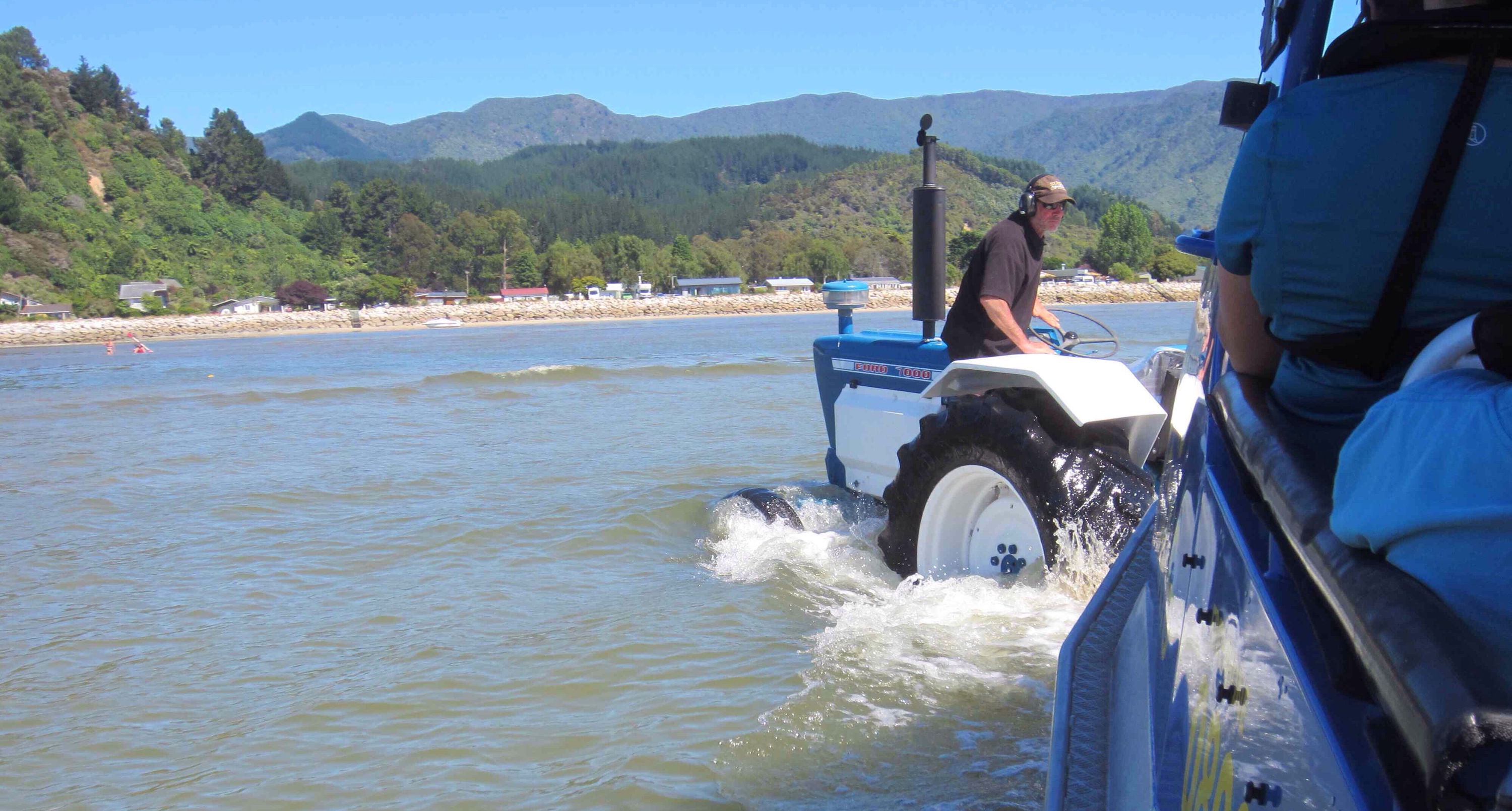 Blauer Himmel und 15 Grad C zum Frühstück. Der bestellte Transferbus ist pünktlich um 10:00 Uhr da. Wir werden zum Stützpunkt der water taxis gebracht und steigen auf dem Hof in das Boot, das auf einem Trailer liegt, um. Ein Trecker zieht uns dann ein Stück die Straße runter, über den Strand ins Wasser. Der Skipper sitzt derweil arbeitslos am Steuer.