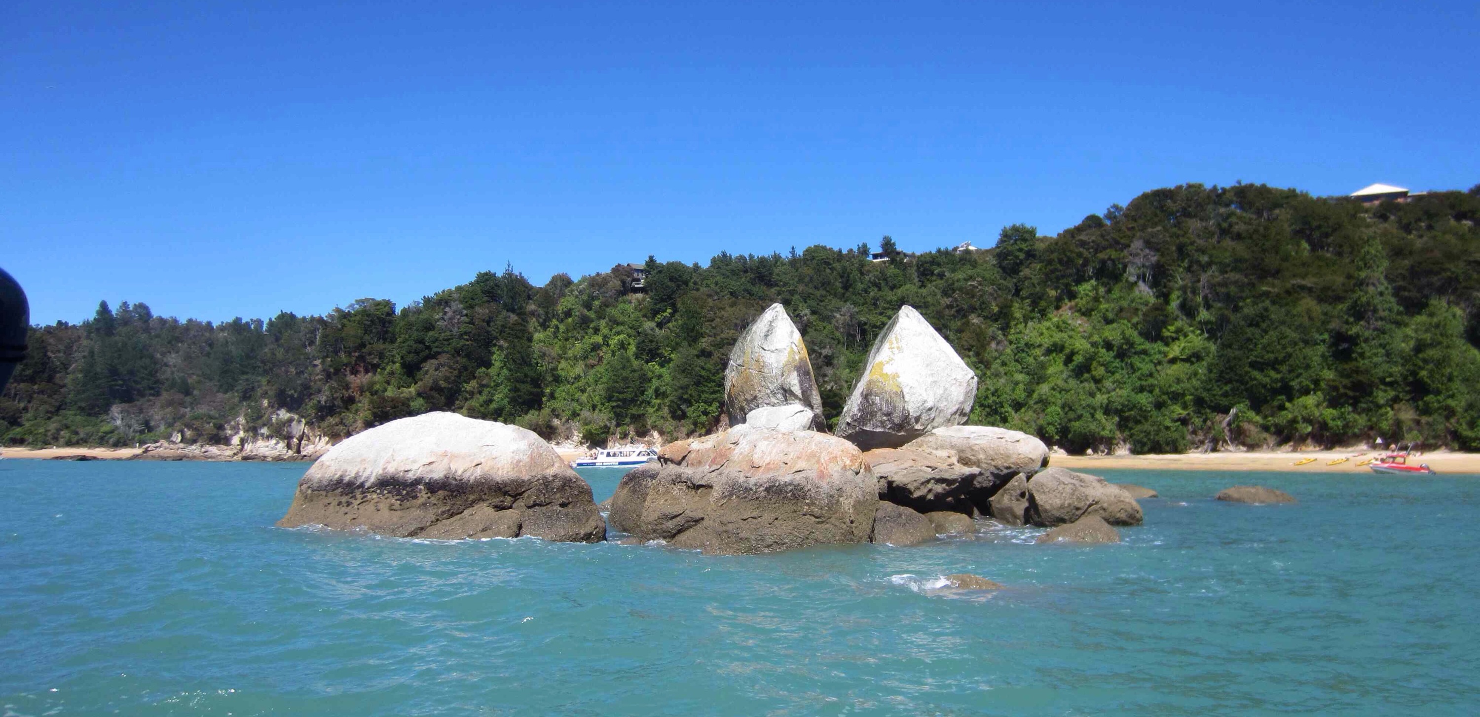 und zum Seehunde gucken an der Adele Island, erreichen wir nach einer Stunde die Bark Bay. Hier steigen wir übers Heck ins flache Wasser und waten an den Strand. Dort gibt es einen kleinen Campingplatz, auf dem wir uns den Sand von den Füßen spülen und die Schuhe wieder anziehen können. Danach erkunden wir das gerade trocken gefallene Inlet – der Tidenhub beträgt hier fünf Meter – und amüsieren uns über die Segler, die ihre Campingmöbel ins Watt gestellt haben. Nach einem Picknick am Strand machen wir noch eine kurze Wanderung auf dem Abel Tasman Coast Track.