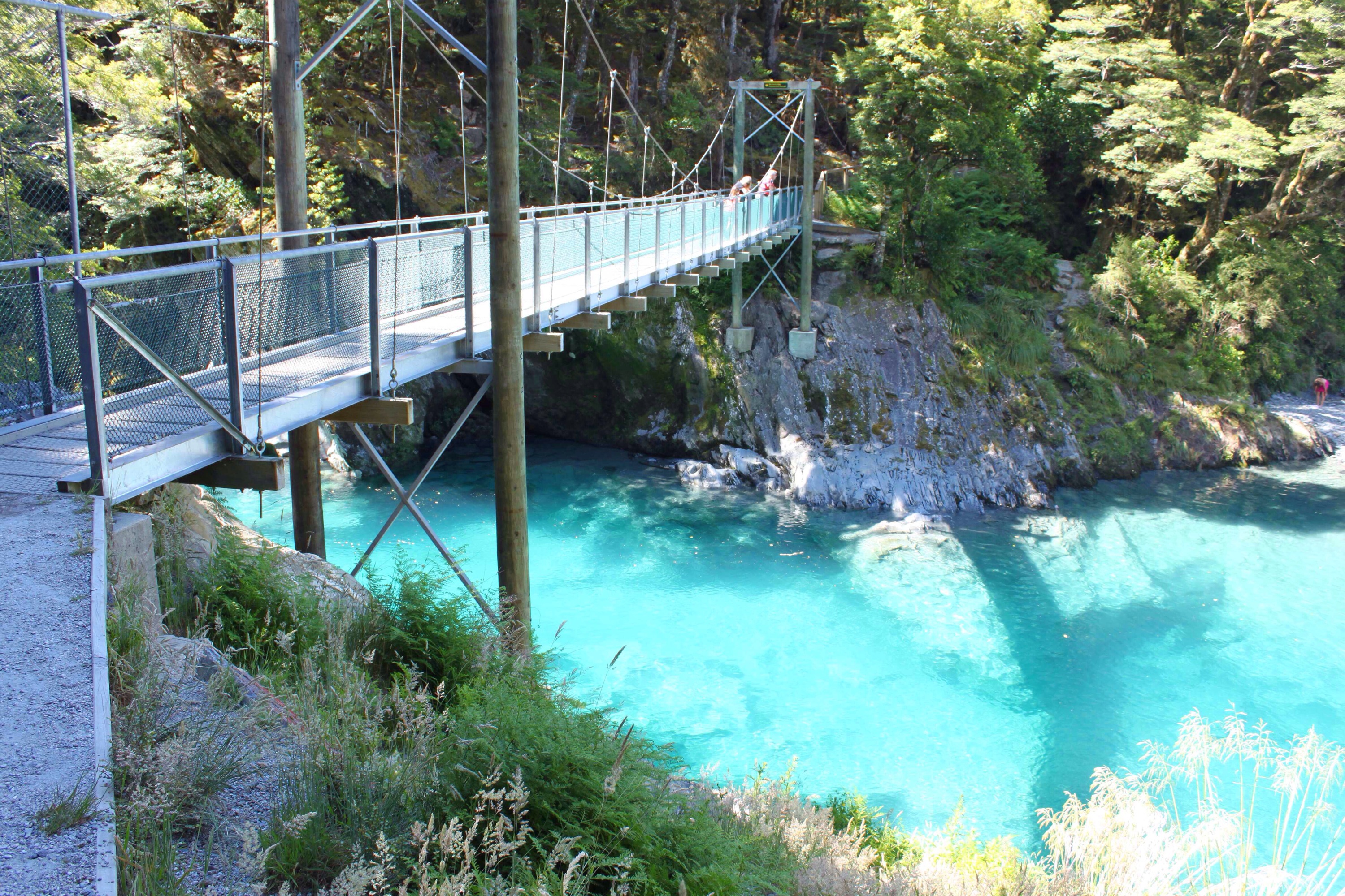 Der Spaziergang heute morgen geht erstmal nur über die Straße zum Stützpunkt vor Gavity Canyon. Hier läuft gerade die Sicherheitsüberprüfung der Anlage. Bungysprünge oder Fahrten mit den Flying Fox (’ne Art Seilbahn) durch den Canyon, und unter der Brücke durch, sind daher zur Zeit nicht möglich. Also haben wir uns damit begnügt, von der Brücke aus einen Blick in die Schlucht zu werfen: