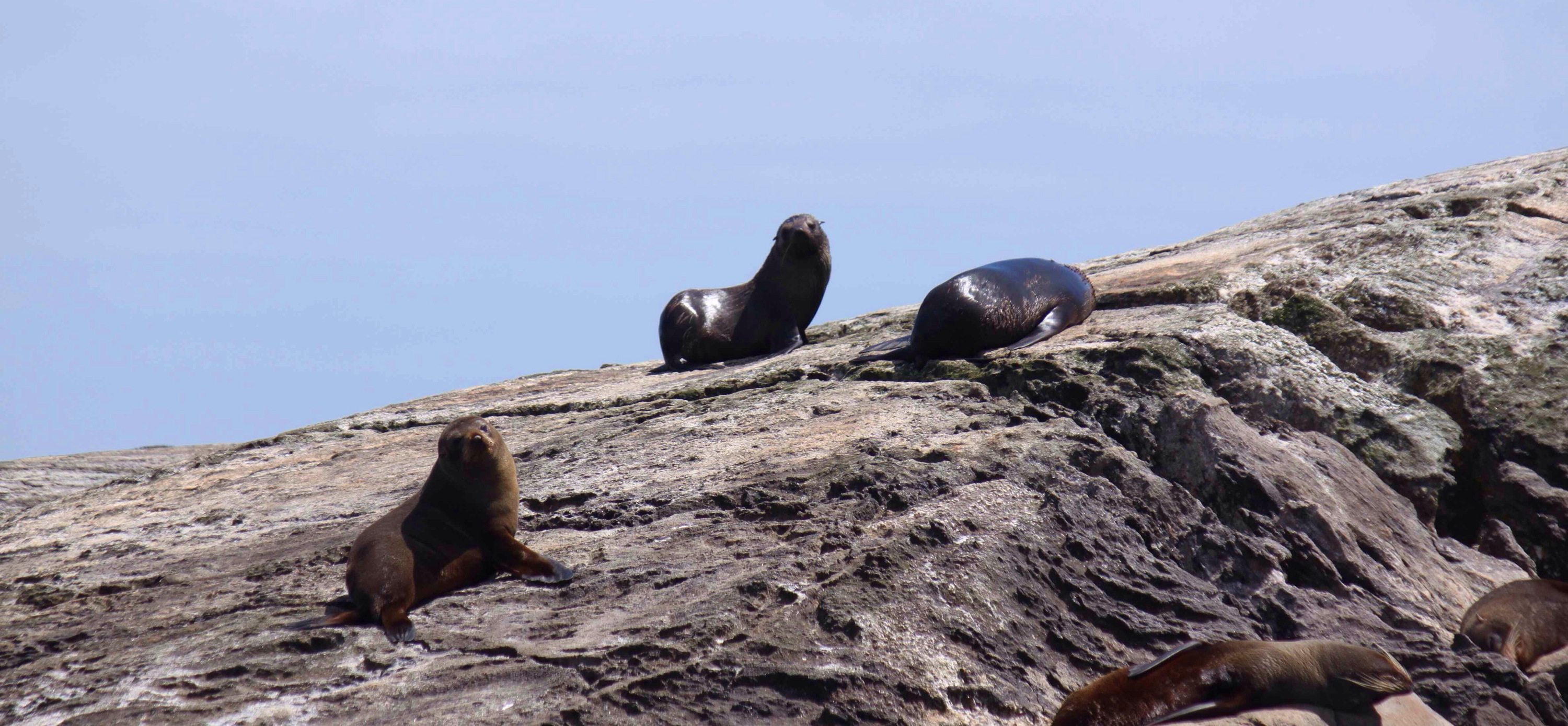 Was für eine Aussicht beim Frühstück, und die Robben tummeln sich zwischen und auf den Felsen.