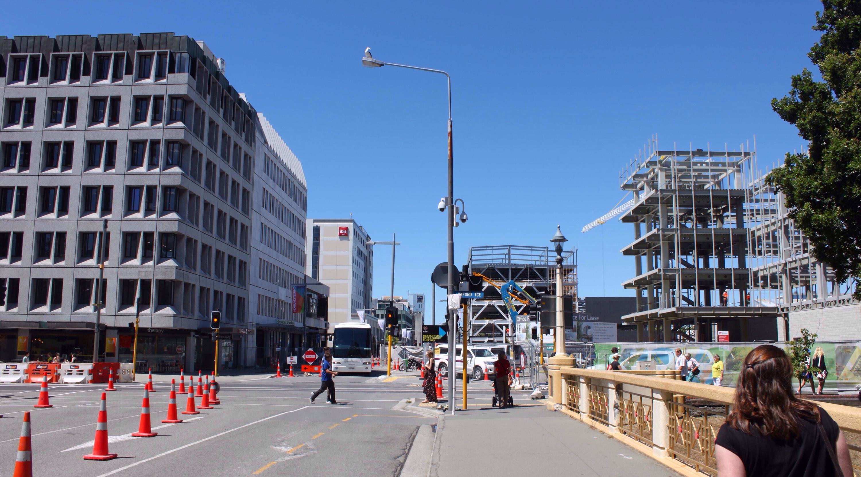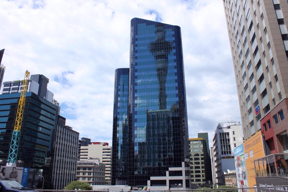 durch die Innenstadt zum Skytower, der sich hier in der Glasfassade spiegelt.