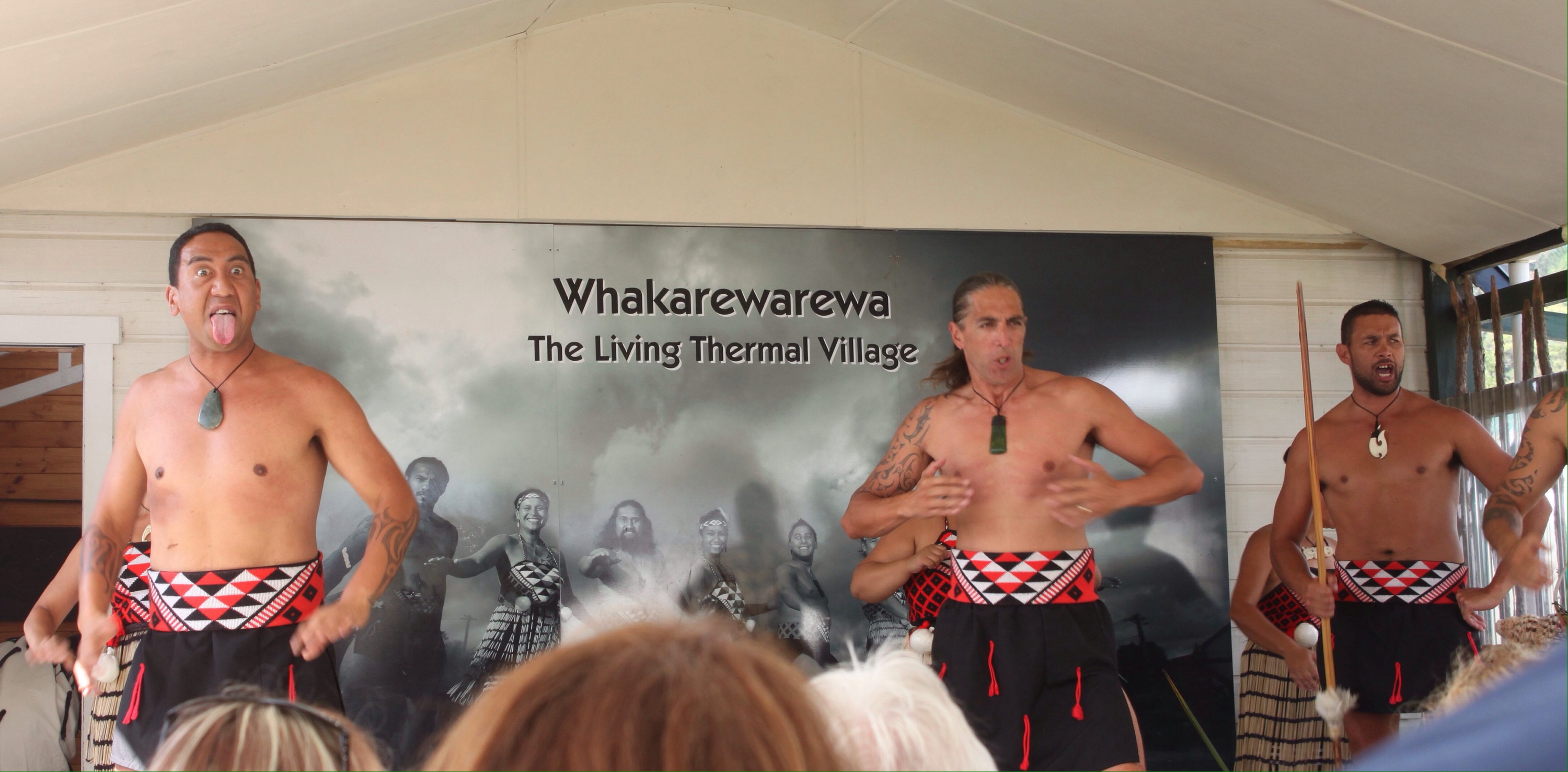 Vorgestern wurde Clemens beim Telefonat mit der Heimat gefragt: „Wird euch nicht langweilig?“. Nun haben wir lange überlegt, was Langeweile eigentlich ist. Schließlich die Erkenntnis und die Antwort: „Gib uns noch zwei Jahre Zeit in diesem Land, und frag dann nochmal nach.“ Vielleicht lautet die Antwort dann: „Ja.“ Um der Langeweile vorzubeugen fahren wir erstmal in’s Maori-Dorf Whakarewarewa (ist kein Schreibfehler, ist nur ne Abkürzung). Hier brodelt die Erde, und das ist wörtlich gemeint. Aber erstmal gucken wir beim Maori dance vorbei. Lina fand den Haka (Kriegstanz) am besten.