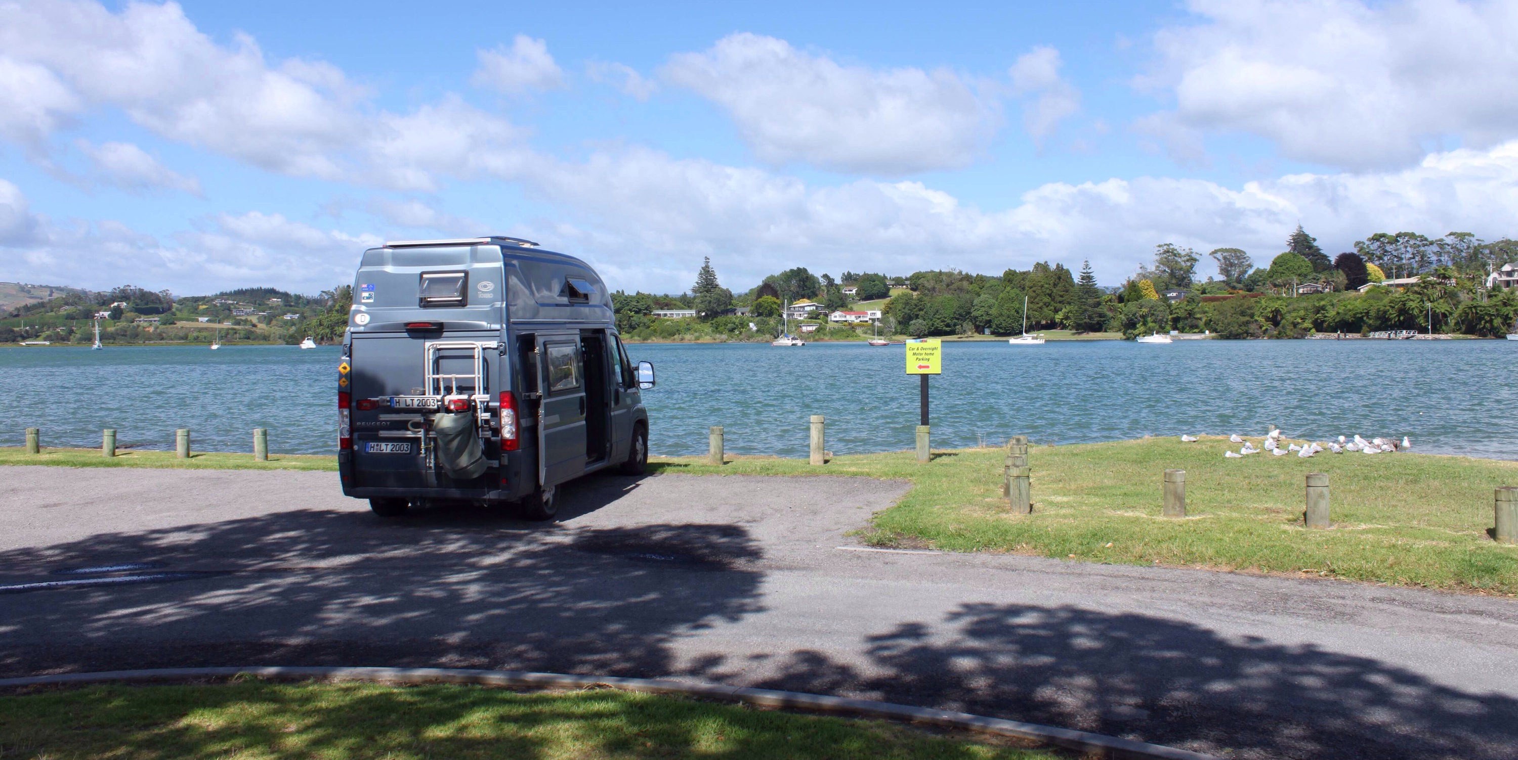 Die Stellplatzsuche gestaltet sich dann schwierig, alle Plätze die wir anfahren sind schon voll, so fahren wir weiter als eigentlich gewollt und kommen schließlich auf dem Carpark des Cowshed Bay Campsite unter – der super nette Caretaker hat ein großes Herz und macht, trotz ausgebuchtem Platz, möglich was irgend geht.