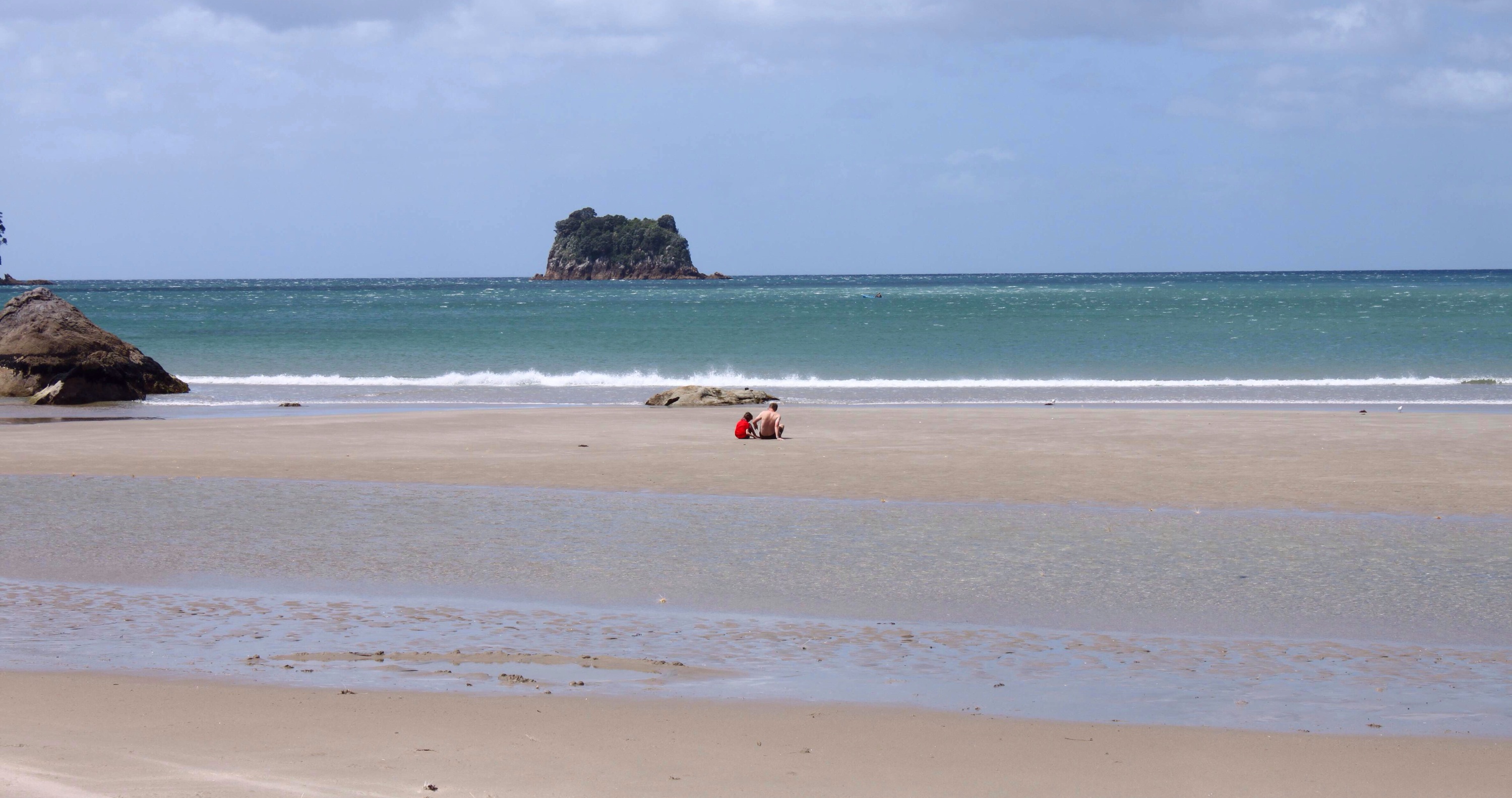 Wenn hier Freitag ein Feiertag ist, dann ist das auch nicht anders als bei uns auch. Es ist langes WE und ein Monteur für unseren Reifen ist nicht aufzutreiben. Na dann muss das bis Montag warten. Wir nutzen derweil das Wetter und gehen nochmal an den Strand. Diesmal an den „Hot Water Beach“. Hier kommt an einer Stelle Thermalwasser mit über 60 Grad aus dem Sand, der bei Niedrigwasser frei liegt. So ca. 150 Leute buddeln sich dann kleine Pools und suhlen sich dann im warmen Sandwasser. Clemens fällt bei dem Anblick ein Vergleich ein, den er aber nicht öffentlich schreiben möchte. 😉 Wir suchen uns einen ruhigeren Strandabschnitt und haben viel Spaß in der Brandung. Nachmittags begucken wir noch die Cathedral Cove. Der Ausblick macht dann doch Lust auf einen Spaziergang runter in die Bucht. Da es schon spät ist, bleiben wir einfach über Nacht hier, verschieben das auf morgen und schauen am Abend noch den Seglern zu, die unten vor Anker gehen.