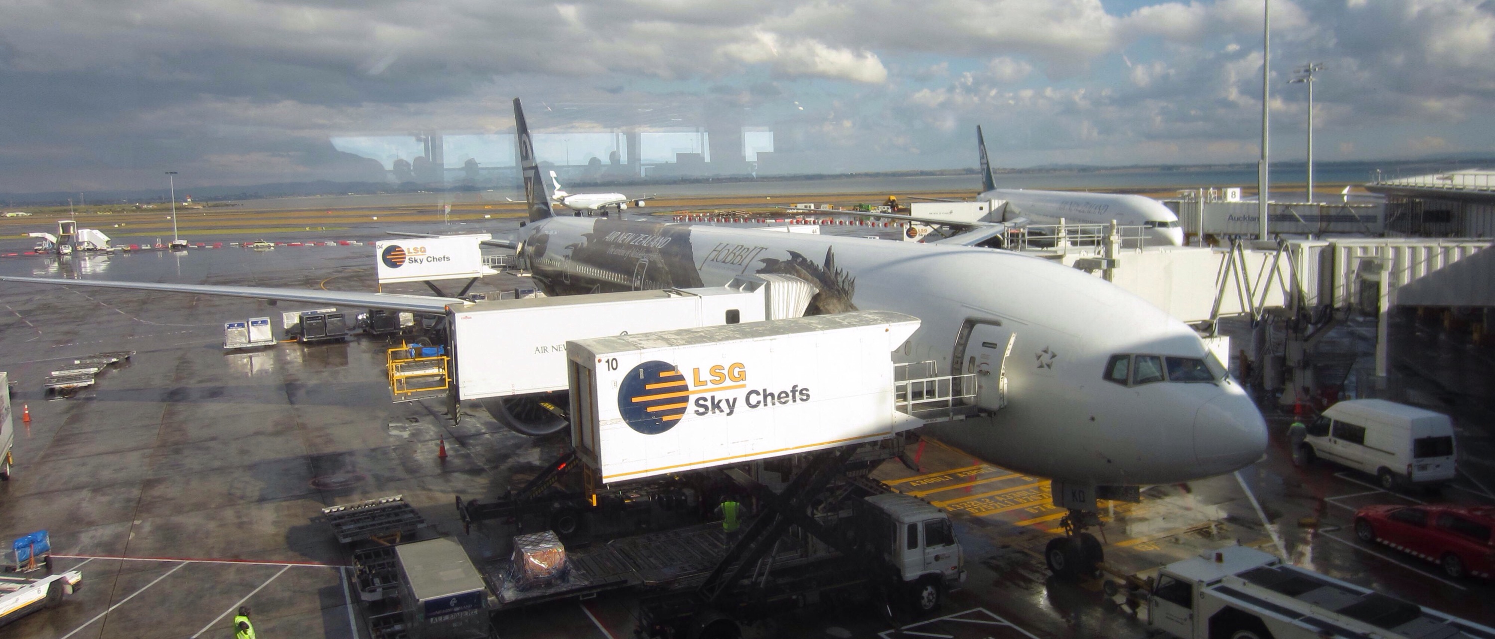 Wir schlendern noch ein wenig durch Aucklands CBD und nehmen dann den Airportlink Bus zum Flughafen. Unsere 777-300 der Air New Zealand wartet da bereits, natürlich mit Hobbitbemalung. Na dann fliegen wir heute mal mit Smaug. 😉