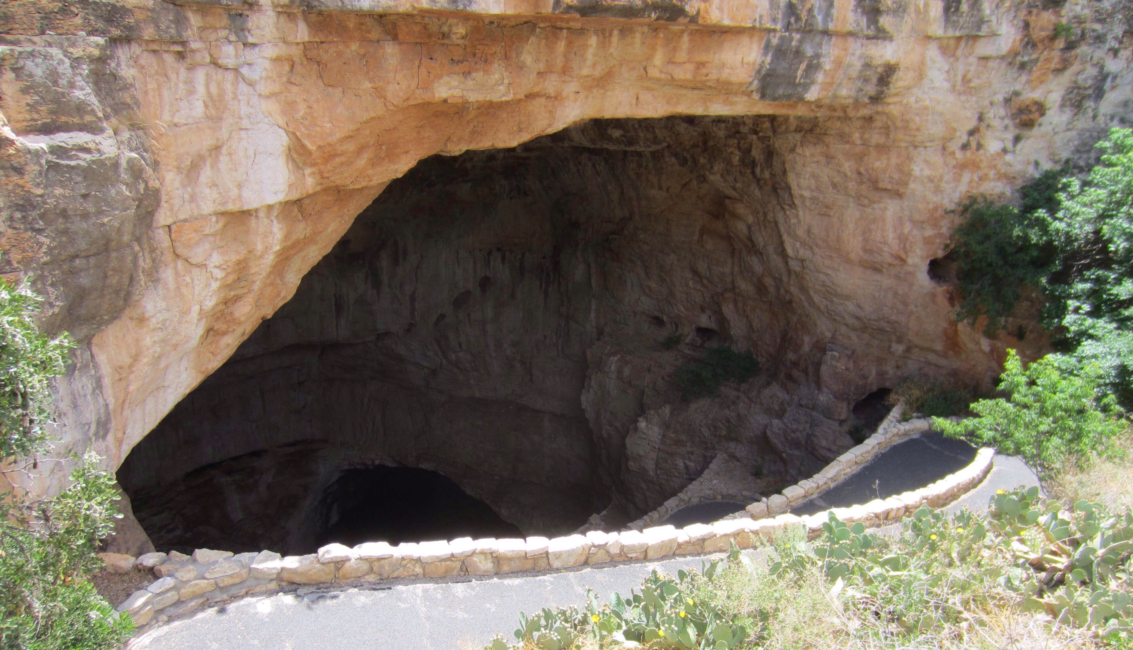Abends warten wir dann noch am natürlichen Eingang auf die Bats. Bei Sonnenuntergang sollen hunderte von Fledermäusen auf Futtersuche ausschwärmen. Und tatsächlich, nachdem wir so gegen 7:15 PM da sind und einen sehr guten und lockeren Vortrag eines Rangers zur Einstimmung genießen dürfen, fliegen so ab 8:00 Uhr die Bats in Schwärmen aus der Höhle. Auch wenn so an die 80 Leute da sind, ist es jetzt ganz still. Fast können wir den Flügelschlag der Tiere hören. Elektronische Geräte und auch Fotoapparate sind, um die Tiere nicht zu verwirren, leider streng verboten und müssen ausgeschaltet werden. – Keine Bilder von den Bats😩 aber vom Höhleneingang an Tage: