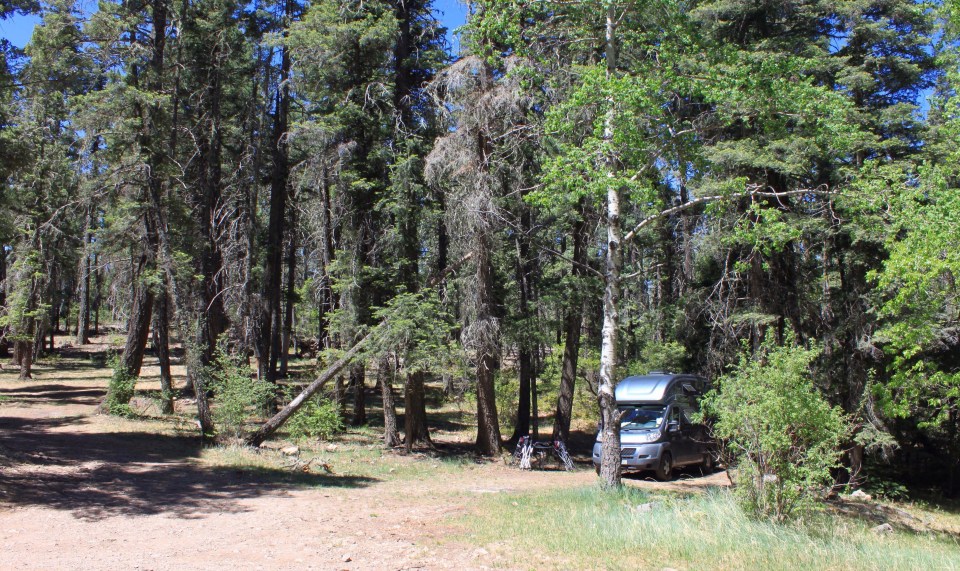 oder wie heute kühl und schattig in 2500 m über NN im National Forest. Auf diesen Flächen darf man legal campen.