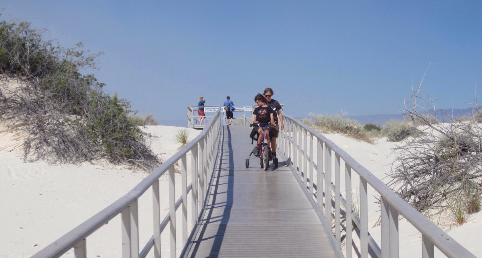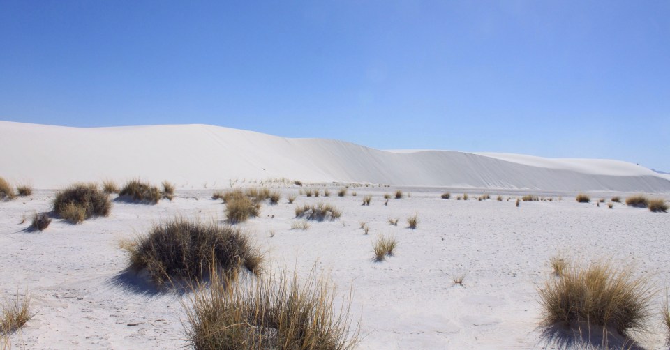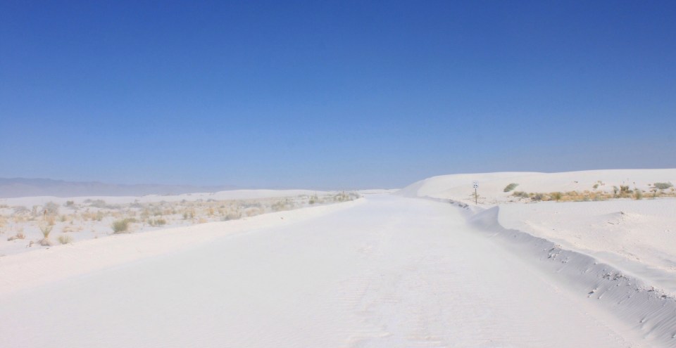 hier hat Gips den Sand weiß gefärbt. Wir können meilenweit durch eine schneeweiße Wüste fahren, (die Wege werden mit Schneepflügen freigeschoben)