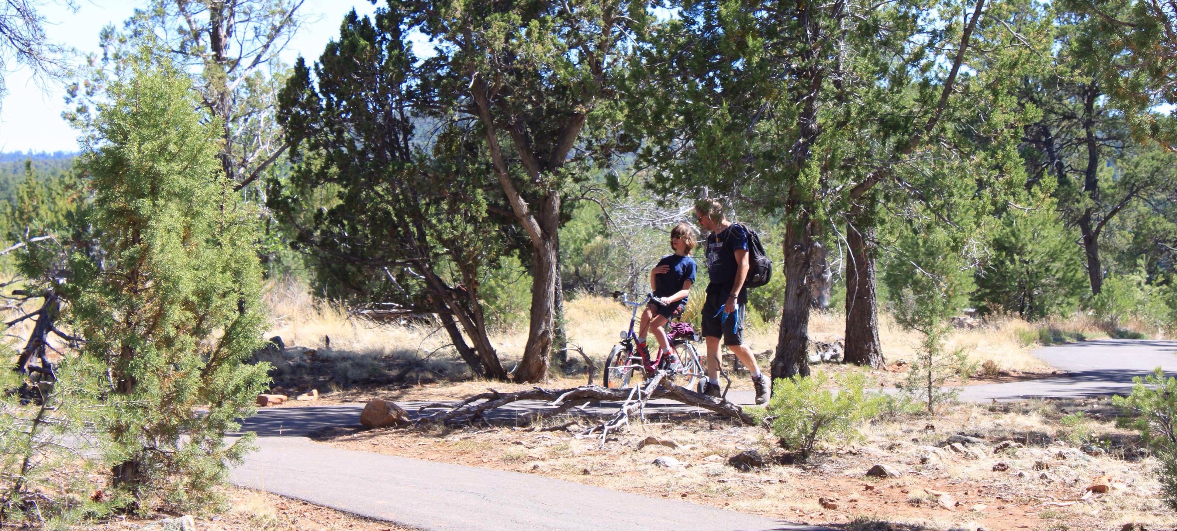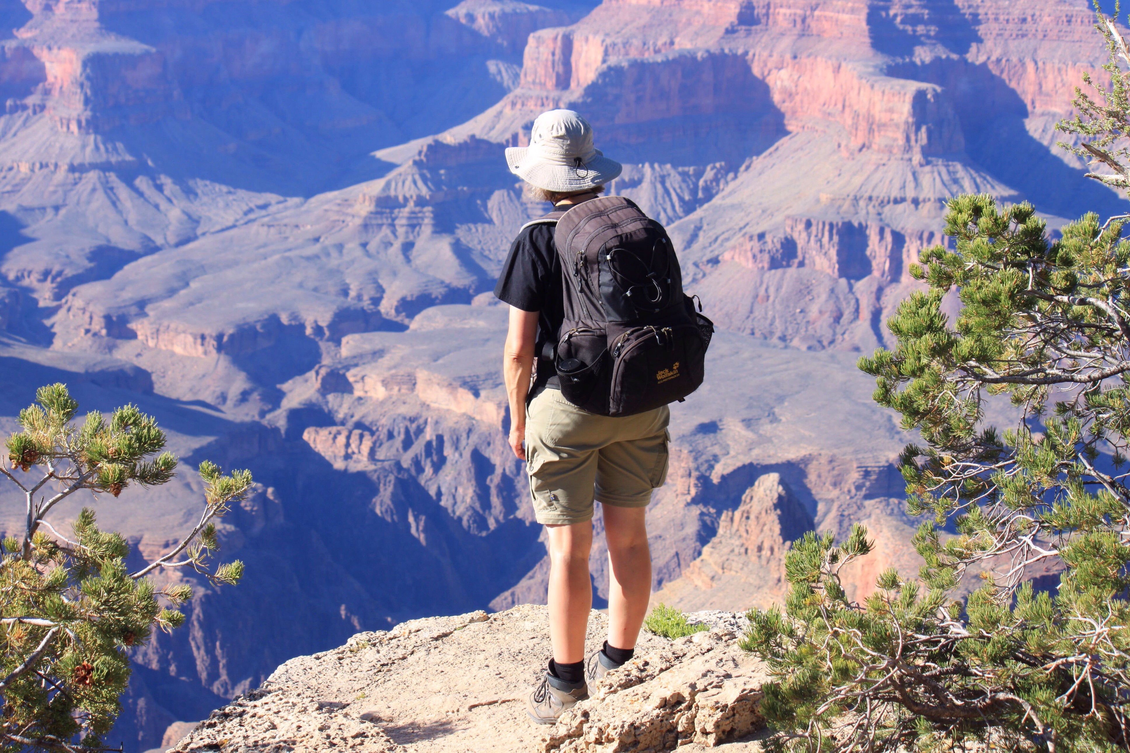 Und nun auf zur größten Touriattraktion in Arizona, dem Grand Canyon. Da alle Canpingplätze vorbestellt oder bereits am Vormittag belegt sind, und wir ja bekanntlich nicht die frühesten sind, die morgens losfahren, nutzen wir den Kaibab National Forest, der direkt südlich an den Grand Canyon Nationalpark angrenzt, um legal im Wald zu übernachten. An einem Forstweg finden sich zahlreiche „Pullouts“ von denen wir uns einen aussuchen. Am nächsten Morgen (besser gesagt Vormittag, wir sind morgens nicht so schnell) hat sich vor der Einfahrt zum Nationalpark bereits ein Stau gebildet und es dauert bis mittags, bis wir auf dem Parkplatz am Visitor Center ankommen. Ein netter Plausch mit zwei Wolfsburgern die mit ihren eigenen Motorrädern unterwegs sind verzögert den Weg zur South Rim noch ein wenig und dann der erste Blick in den Canyon.