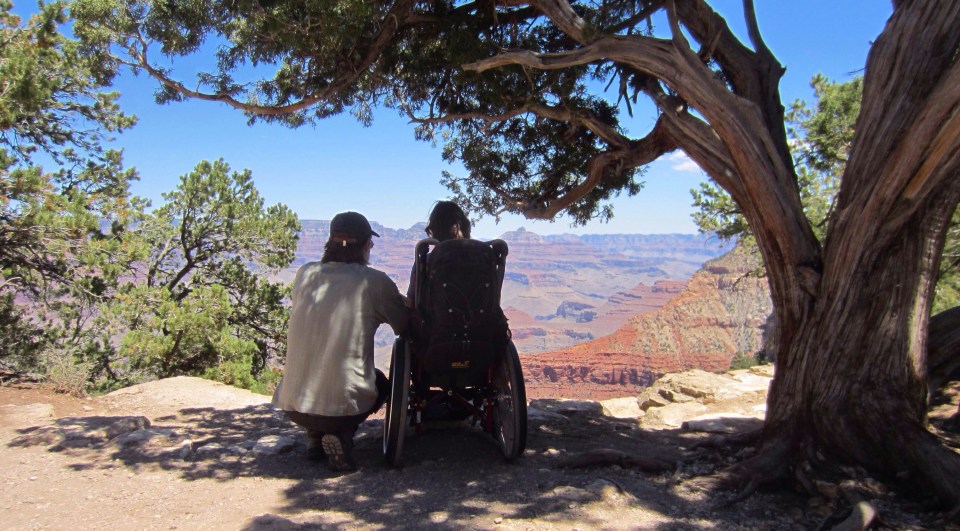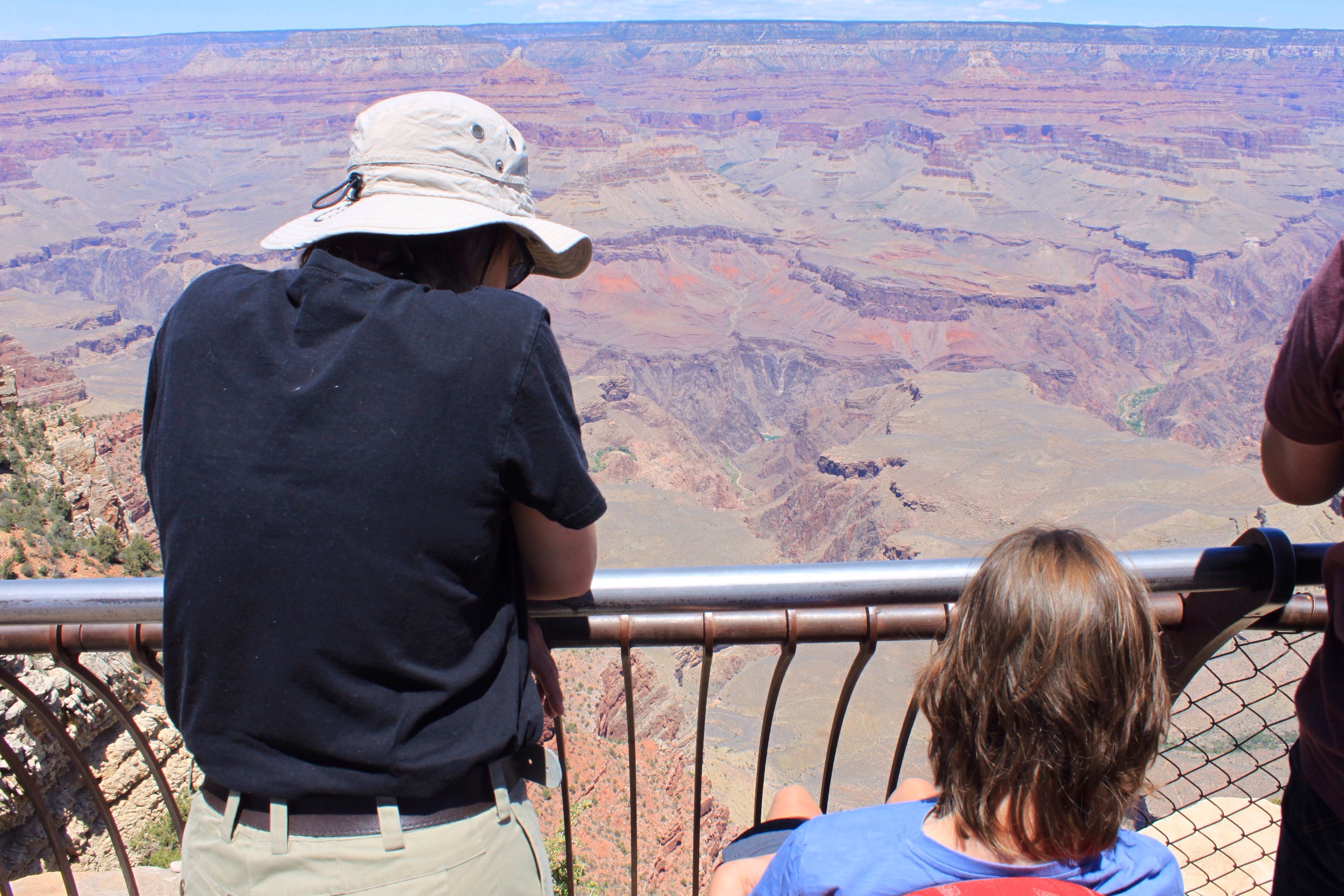 Nach dem (verspäteten) Mittagessen fahren wir mit dem Shuttlebus Richtung Hermits Rest, steigen am Hopi Point aus und wandern ein, zwei Kilometer an der Rim gen Westen. Der Weg ist mit Rolli eher grenzwertig, und Clemens ist froh, die Bremsen zu haben, bietet aber immer wieder tolle Aussichten.