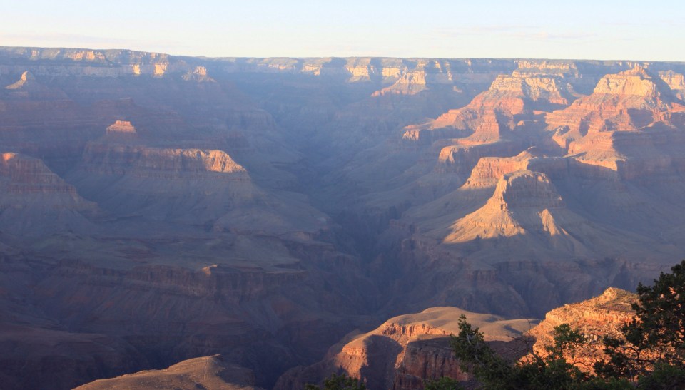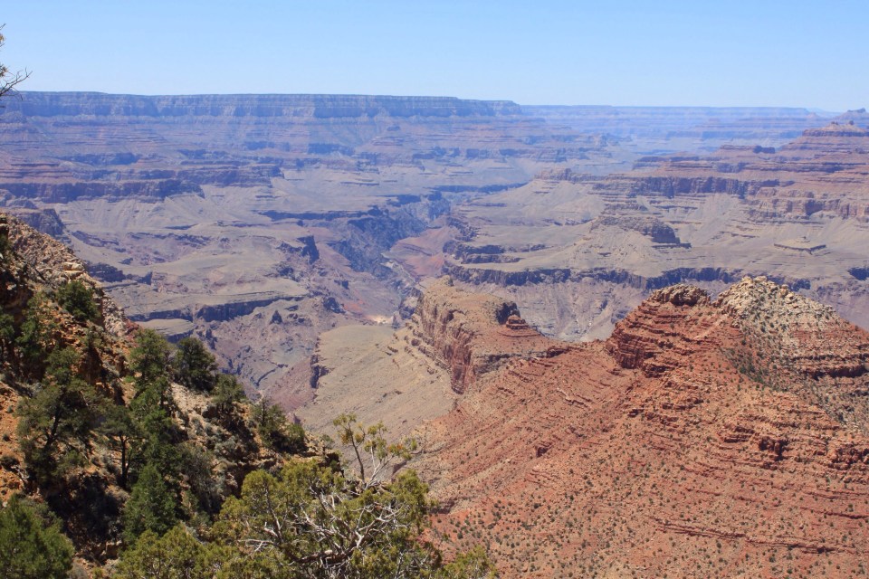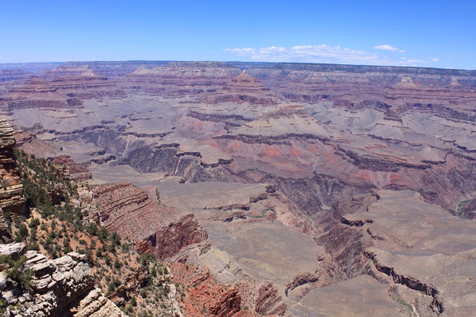 Das Colorado Plateau liegt 2400 über NN und wir blicken in eine 1200 m tiefe Schlucht. Die Abbruchkante auf der anderen Seite (North Rim) ist 16 km entfernt. Wir haben im Vorfeld unserer Reise öfter gehört: „Ihr werdet von der Größe überwältigt sein“, und nun?