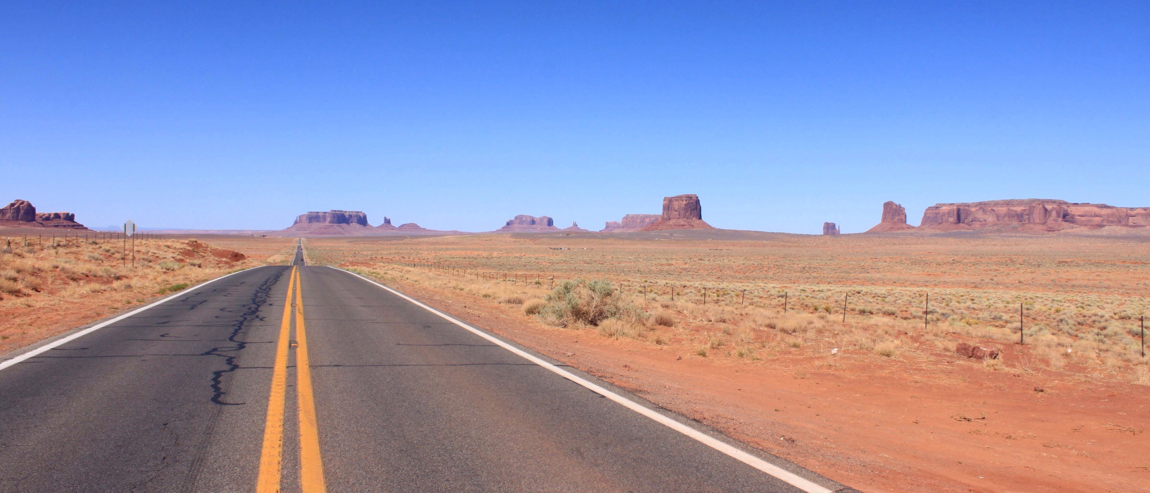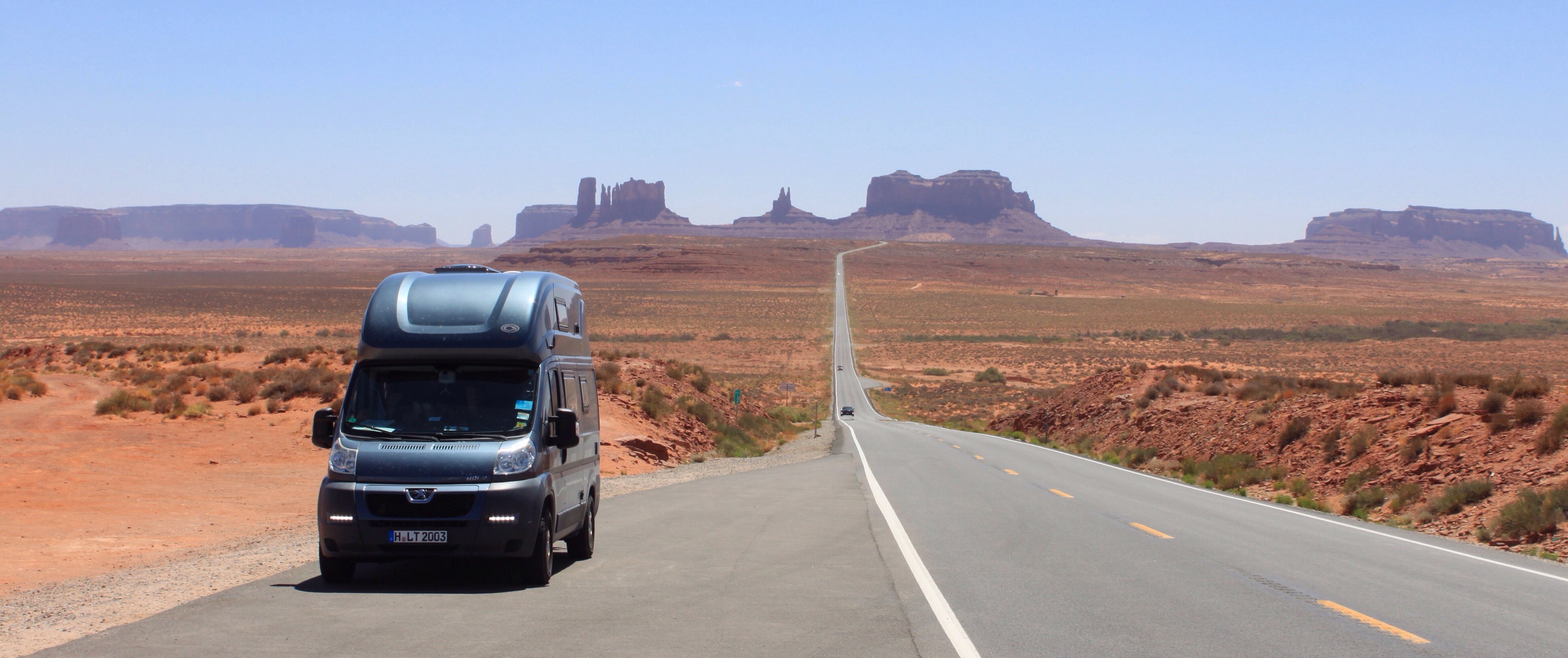 Die Speisekarte lockt uns ins Restaurant (oder ist es der Hunger?) und es gibt traditionelles aus der Navajoküche. Echt lecker! Auf eine Fahrt durch das Tal verzichten wir und fahren weiter Richtung Mexican Hat. Der Blick in der Rückspiegel veranlasst uns noch zu einem Foto.