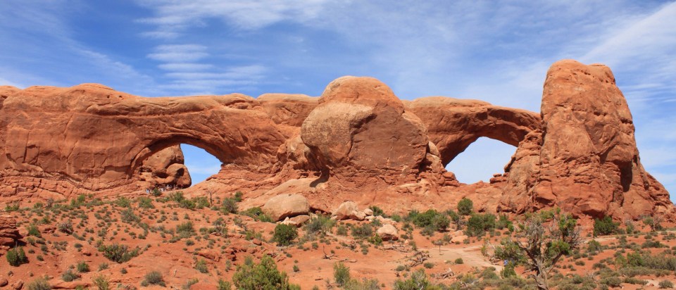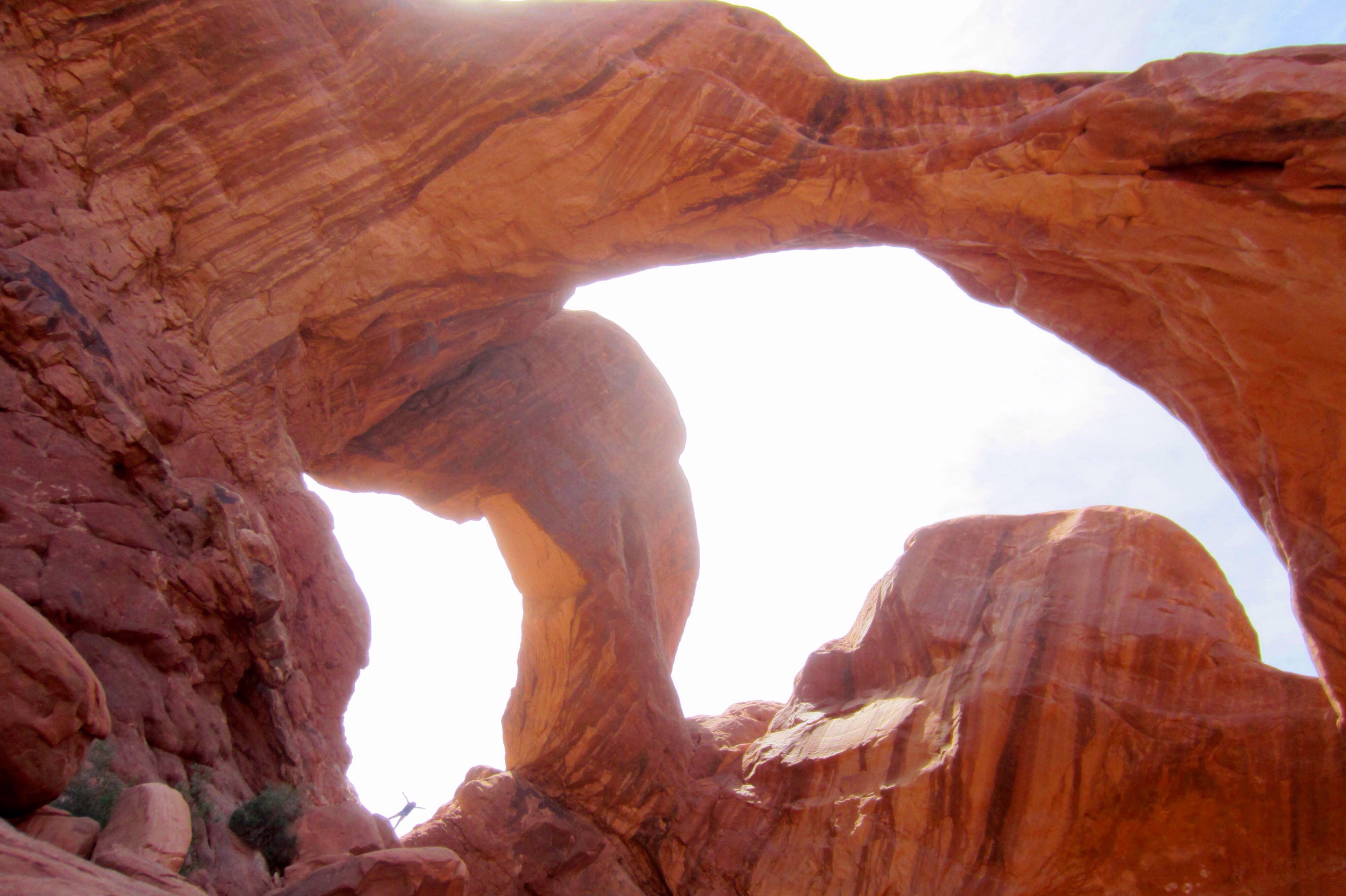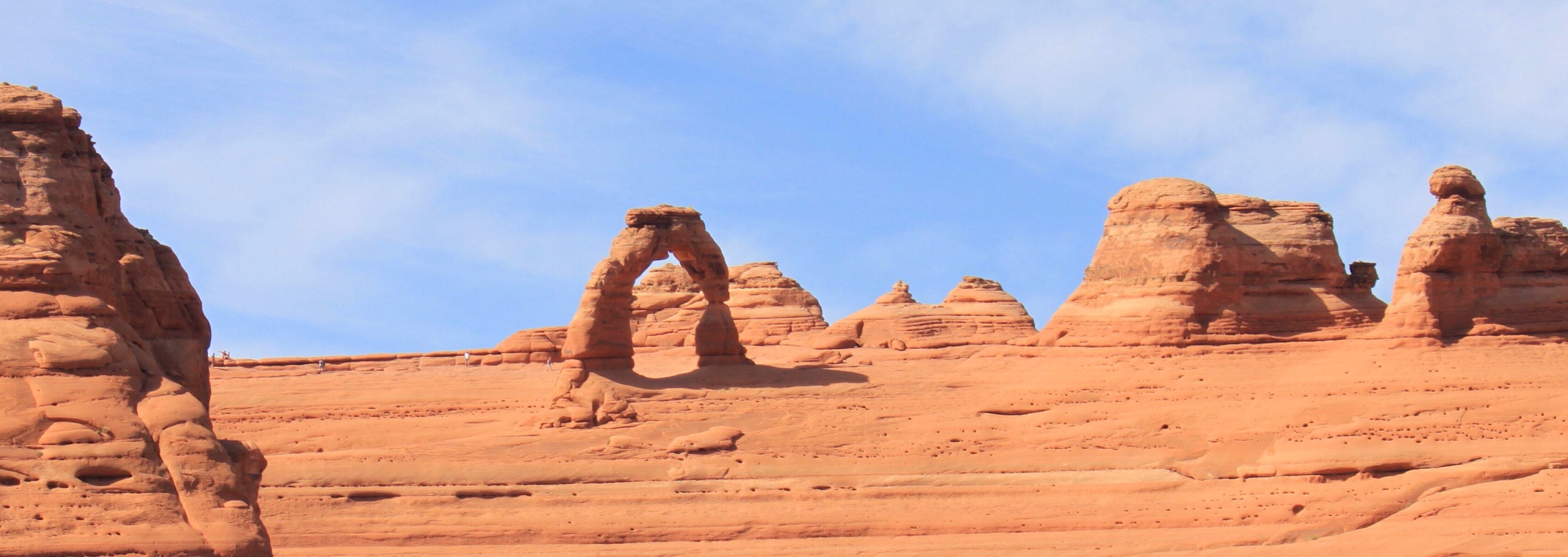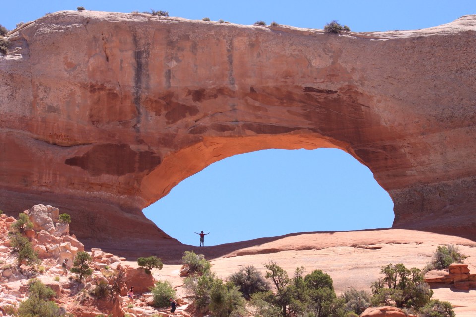Auf dem Weg zum nächsten NP, dem Arches NP, stoppen wir noch am Wilson Arch der direkt an der 191 steht. Sabine muss da gleich raufklettern, und so sieht man auf dem Foto auch gut die Dimension des Arch.
