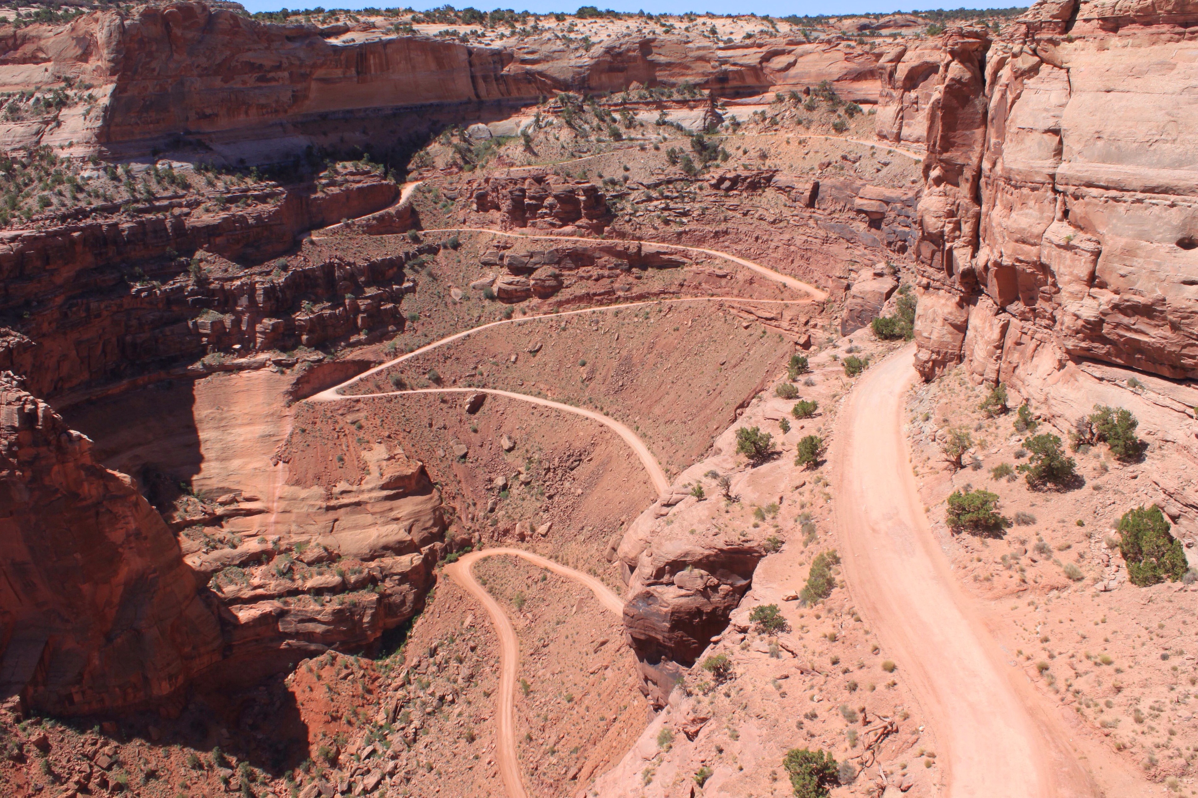 Heute statten wir dem zweiten Teil des Canyonlands NP, der sogenannten „Island in the sky“, einen Besuch ab. Kurz nach der Einfahrt kommt man über eine Felsbrücke, die nicht viel breiter ist als die Straße, von der Hochebene auf die Canyonlands. Hier zweigt der „Shafer Canyon Trail“ von der Hauptstraße ab.