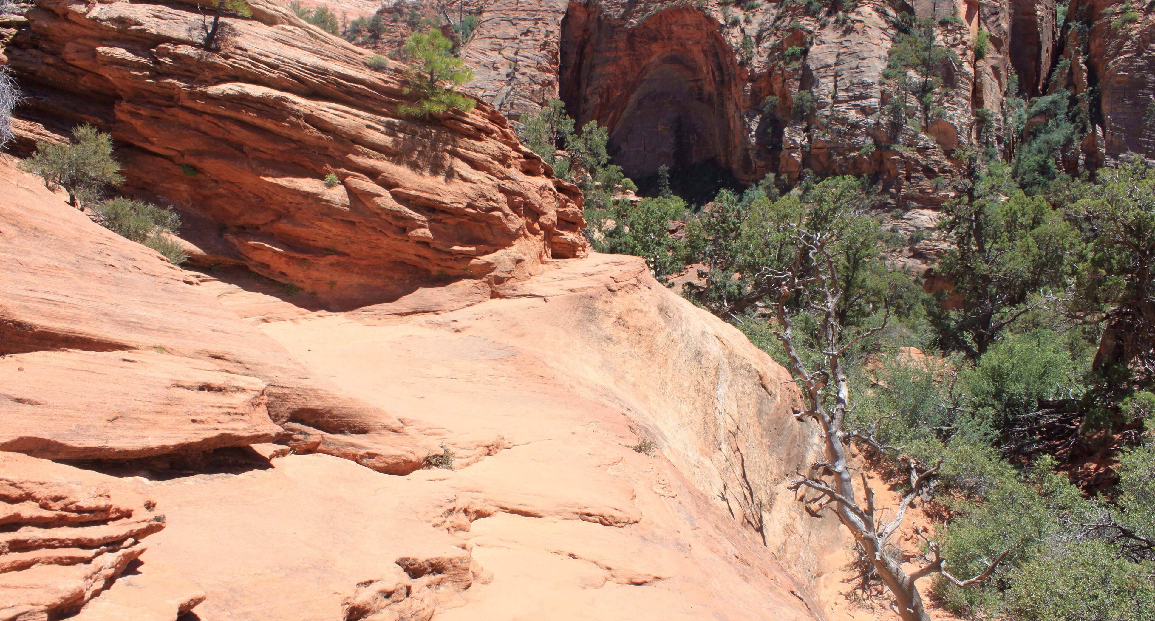Den Zion NP fahren wir von Osten an, und halten vor dem Tunnel am Canyon Overlook. Der Trail zum Overlook selbst ist steil und kaum gesichert. Zitat Clemens: Die haben Sicherungen nur an Stellen angebracht, wo man beim Absturz sofort tot ist. Alle anderen Abschnitte, an denen man ggf. schwerverletzt überlebt, sind ungesichert.