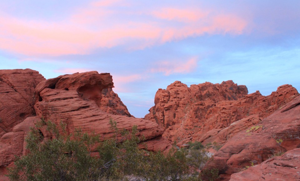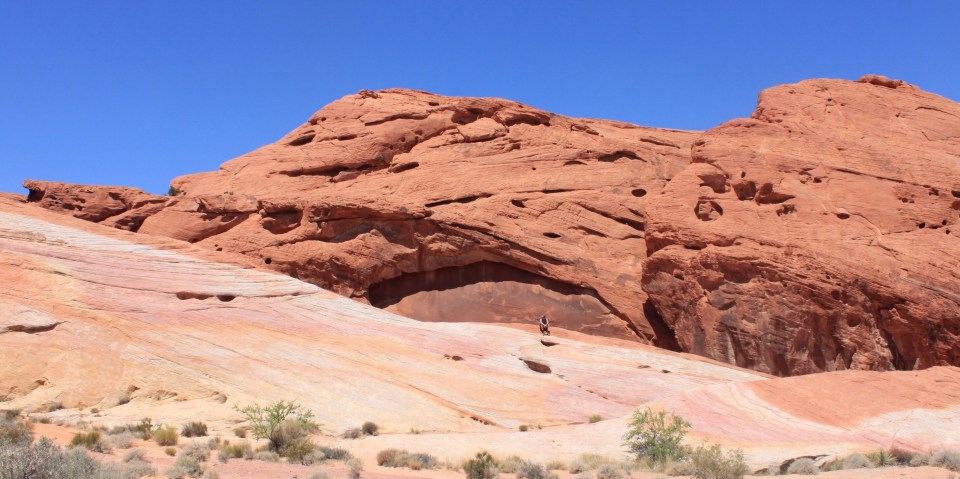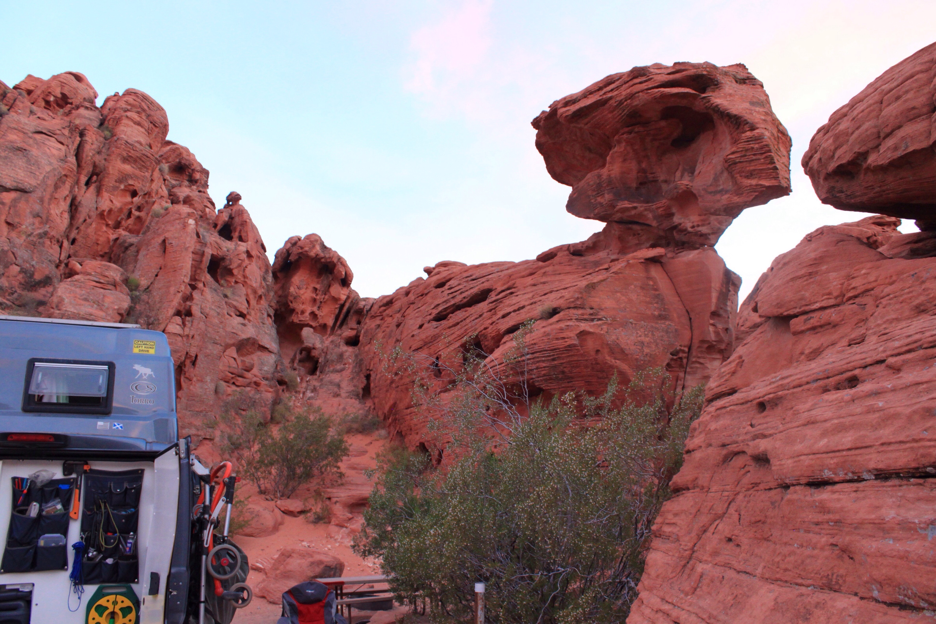 So, oder so ähnlich ist die Gedankenkette in Clemens Kopf… Aber vor der großen Stadt liegt noch der kleine Valley of Fire State Park. Schon bei der Anfahrt merken wir, dass kaum Leute hier sind und wir fragen am Visitor Center nach, ob ggf. noch eine Campsite für uns frei wäre. Freundlich erklärt die Rangerin, dass wir uns selbst umsehen sollten und per Selfregistration einchecken mögen. Die Gebühr für die Tagesnutzung können wir dann auch gleich mit in den Umschlag stecken. Wir finden nicht nur eine Campsite, sondern einen ganzen Campground mit nur einem anderen Gast in Traumlage. Die Auswahl des idealen Übernachtungs-, Grill- und Campfireplatzes fällt echt schwer.😎 Und zum Sonnenuntergang erklären die Felsen den Stateparknamen und leuchten feuerrot.
