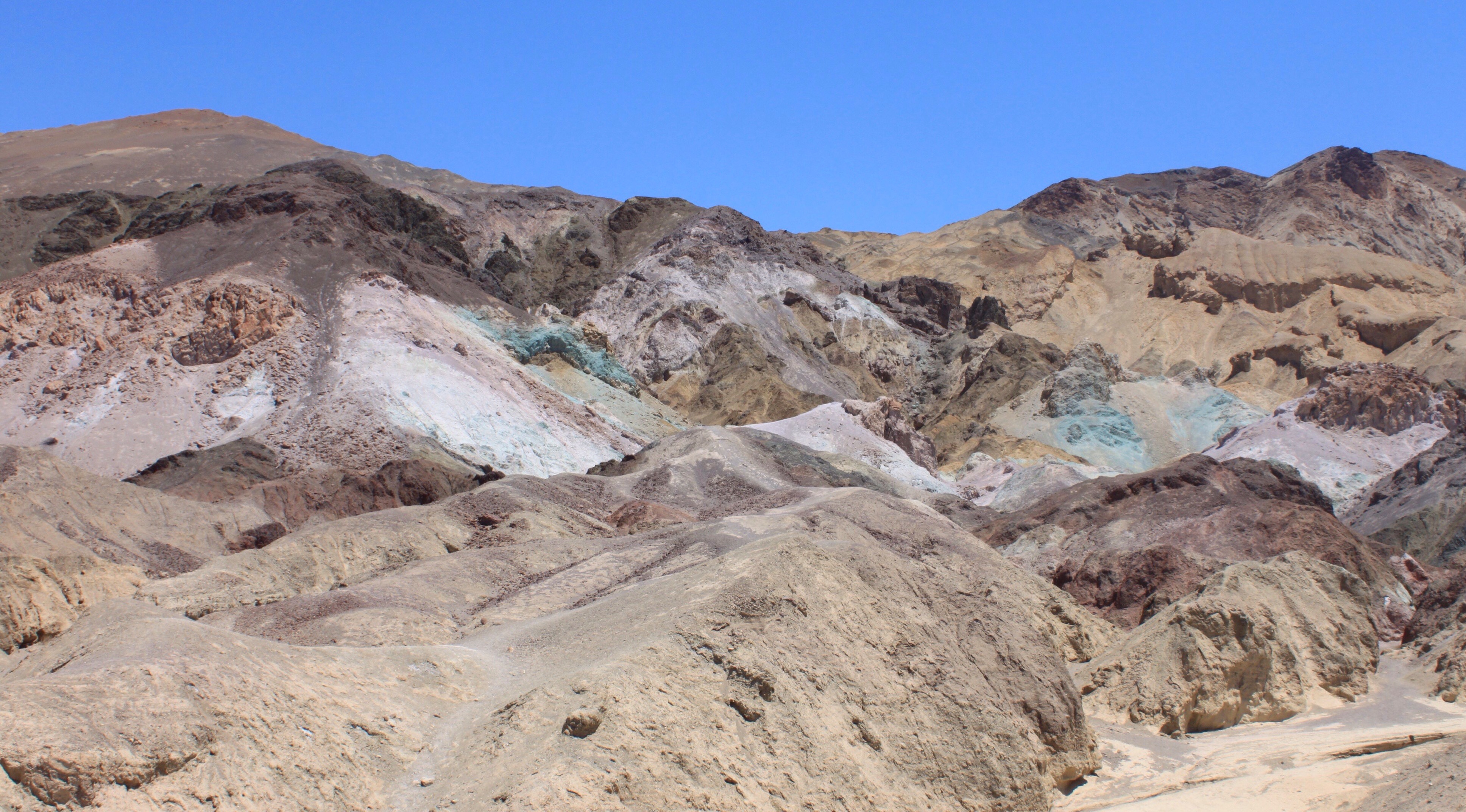 Wir folgen der Empfehlung unseres Reiseführers und fahren den Artist Drive. Dieser ist für Fahrzeuge bis 24 ft begrenzt, für uns also kein Problem. Die einspurige Straße schlängelt sich zwischen den Felsen hindurch und hat achterbahnähnliche Stellen, die von längeren Fahrzeugen tatsächlich nicht passiert werden können. Der Tipp war wirklich gut: In der kargen Landschaft sind die Felsen toll bunt. Der Name passt!