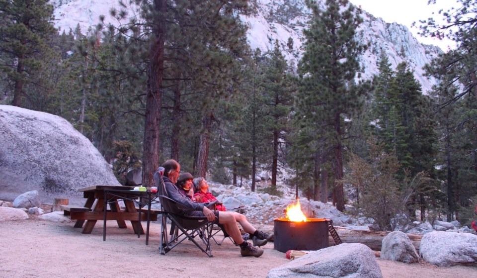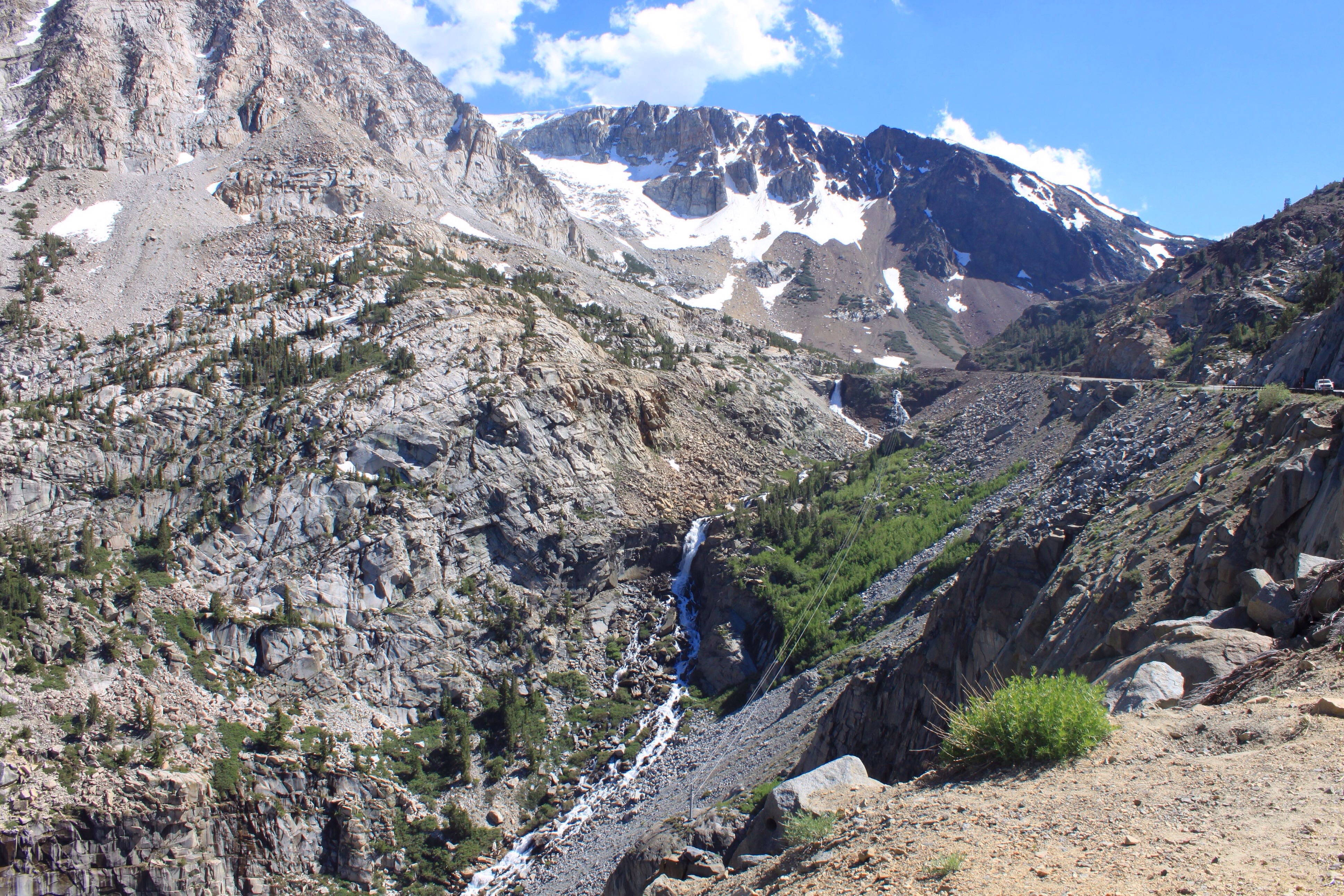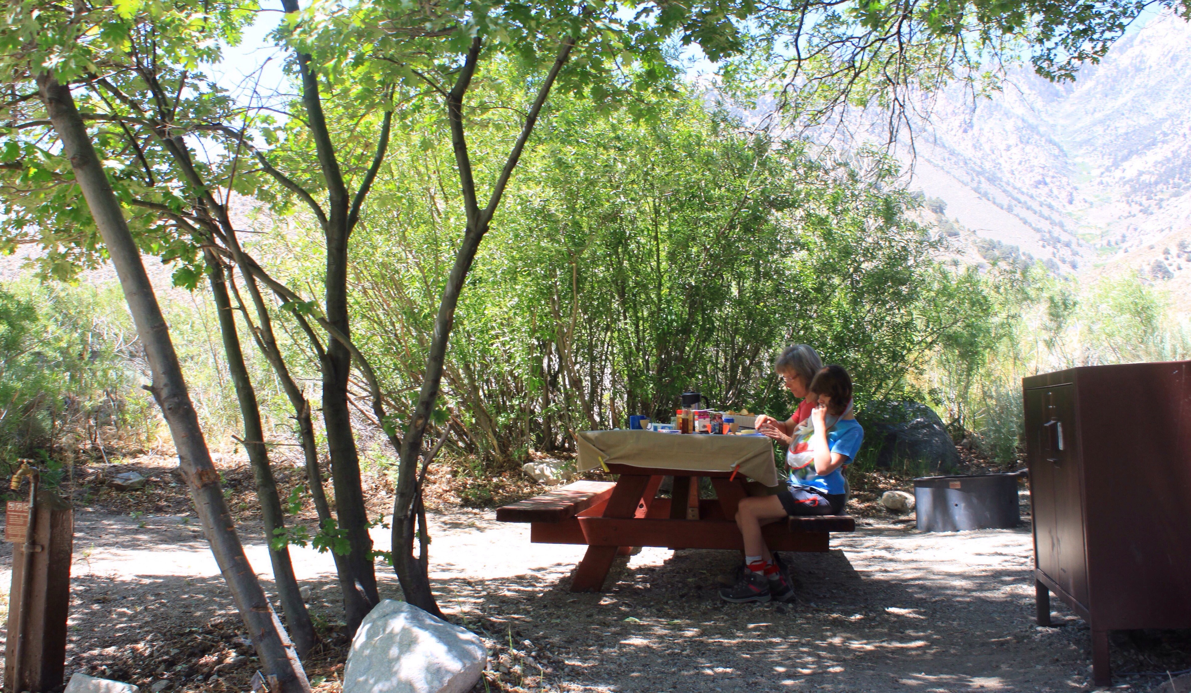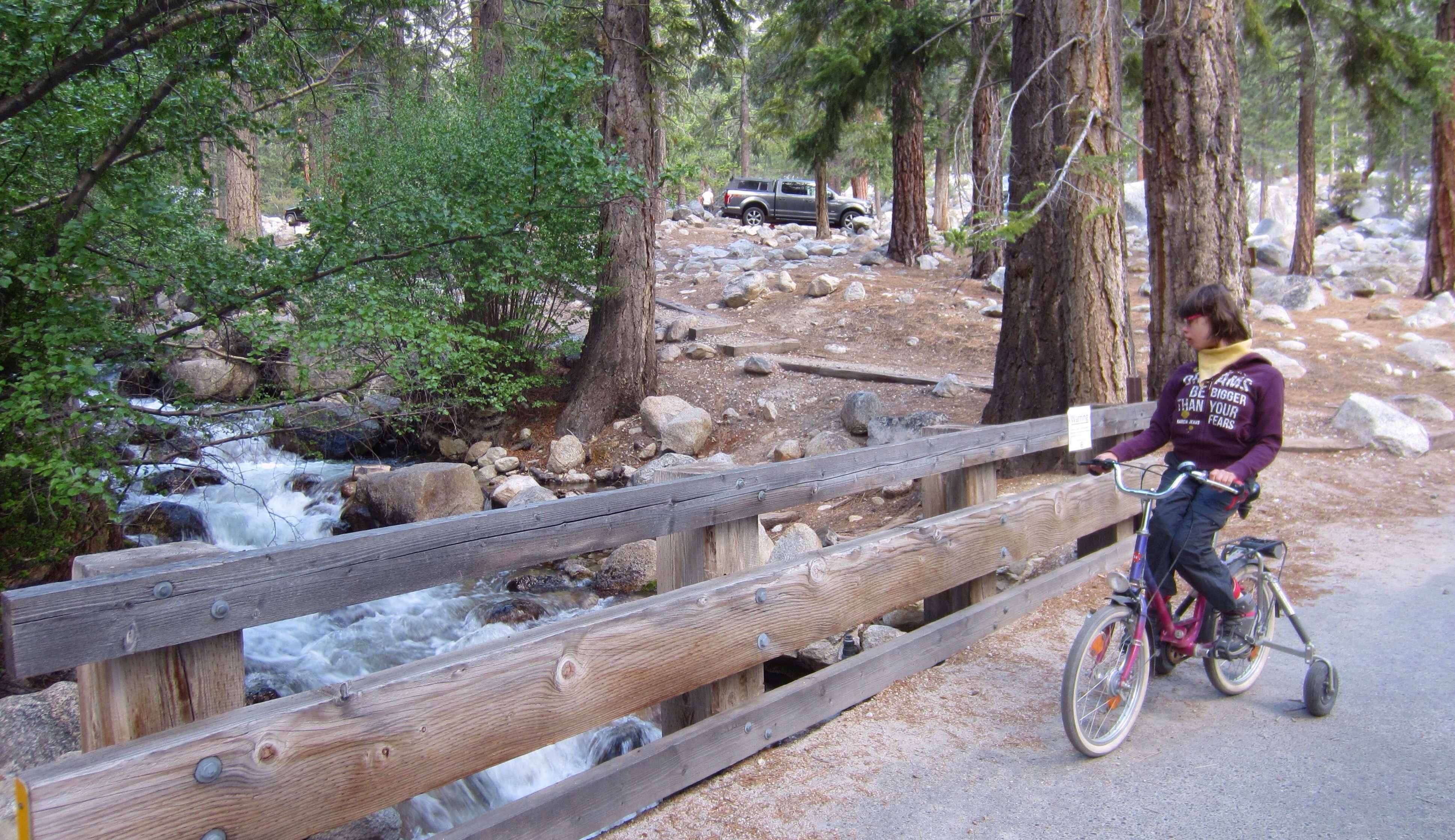 Durch das Owens Valley fahren wir in die Sierra Nevada und übernachten im Grays Meadow NF Campground auf 1800m Höhe mit kaltem Bach direkt neben dem Stellplatz. Was für ein Kontrast, erst die Hitze und Trockenheit (50 mm Niederschlag / a) und jetzt kühle Bergluft und Schmelzwasser im Überfluss, und dazwischen 50 km Luftlinie.
